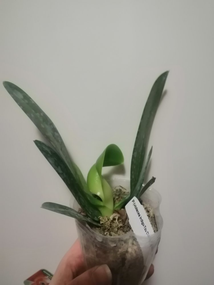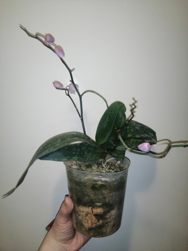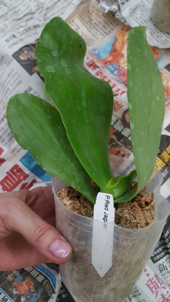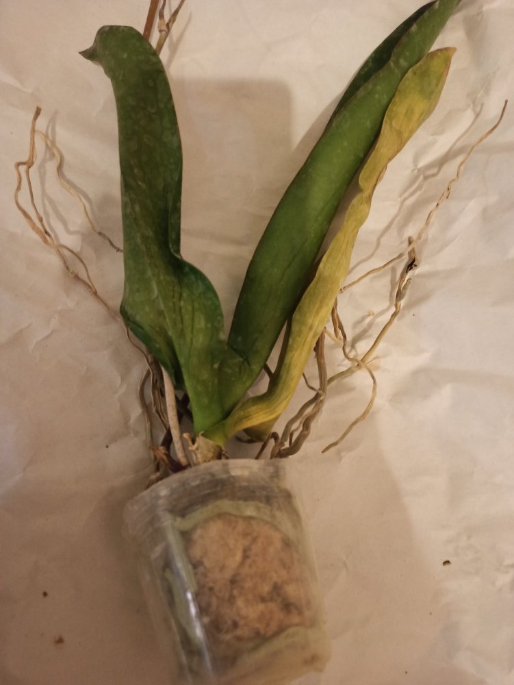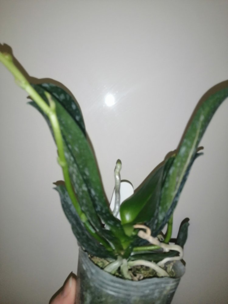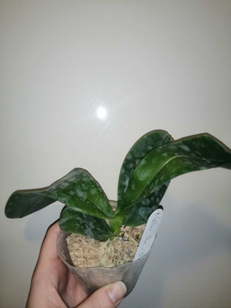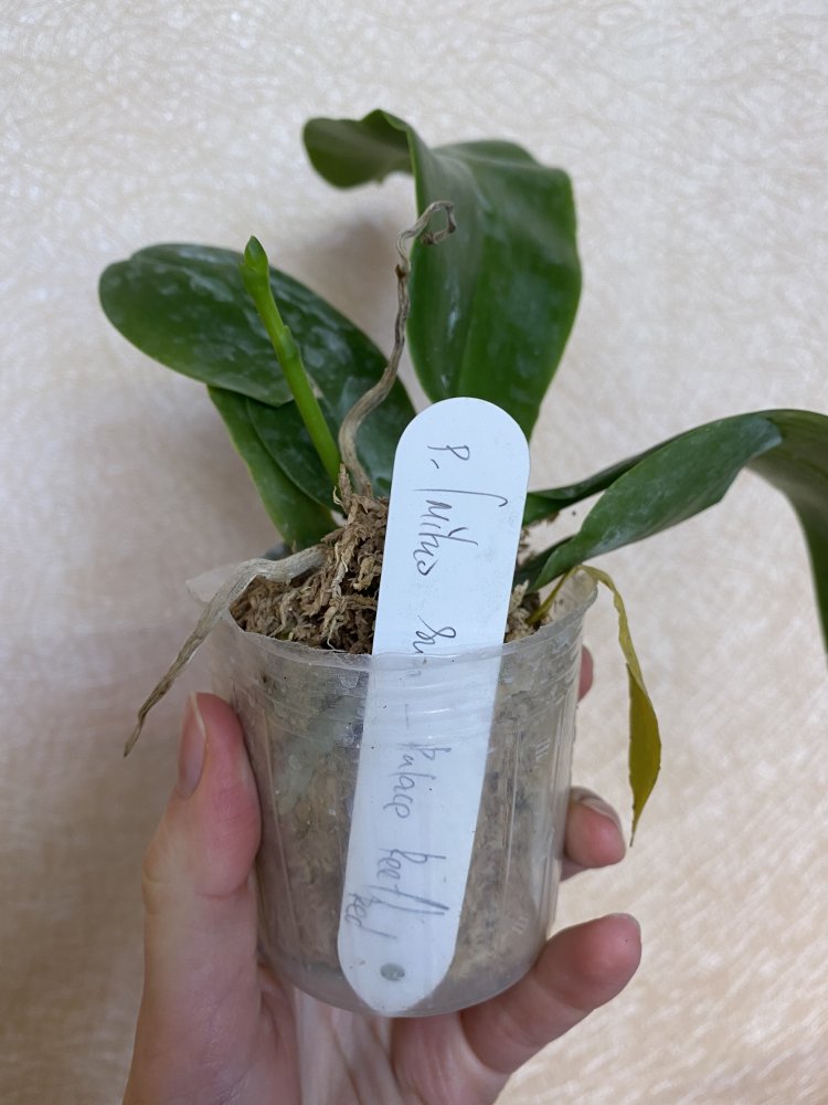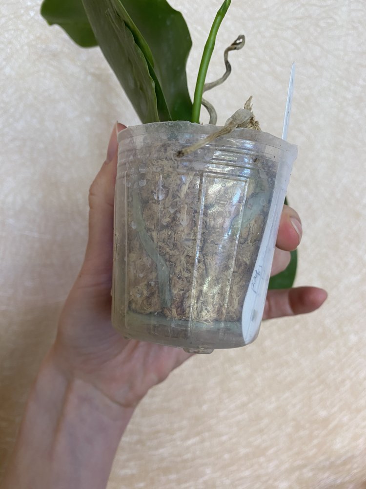 Размер 3,5! Огромная! 3 широкие листа: 20, 20 и 30 см! Тургор незначительно снижен. Мох сухой. Корни чуть высохли, но отопьются. Замят и сломан край у большого листа при упаковке. В остальном прекрасная орхидея за такую небольшую цену. Спасибо Пассифлора.