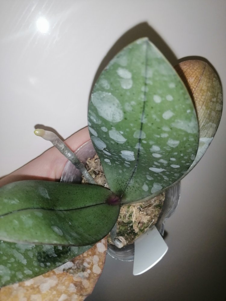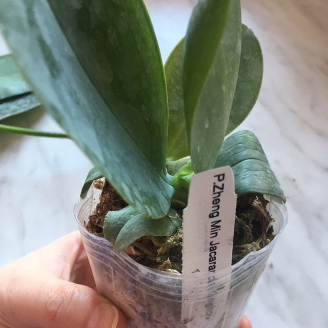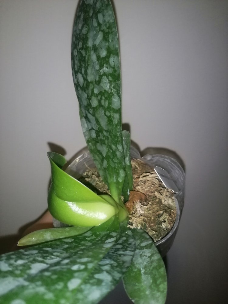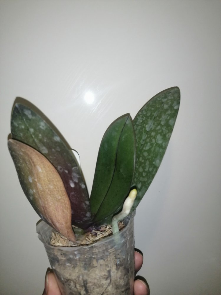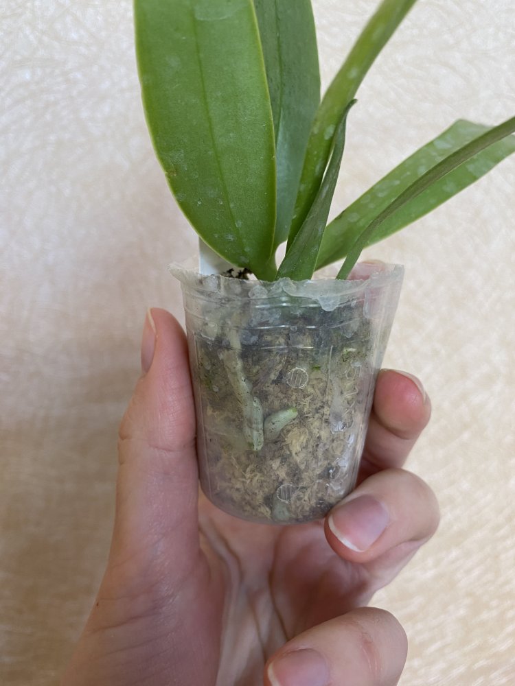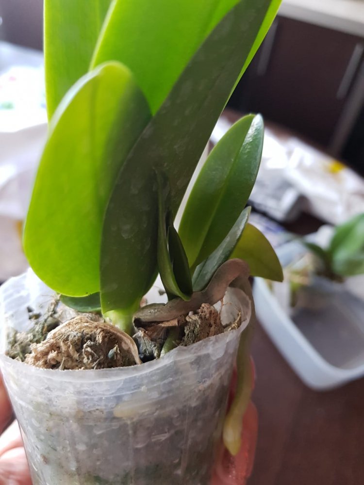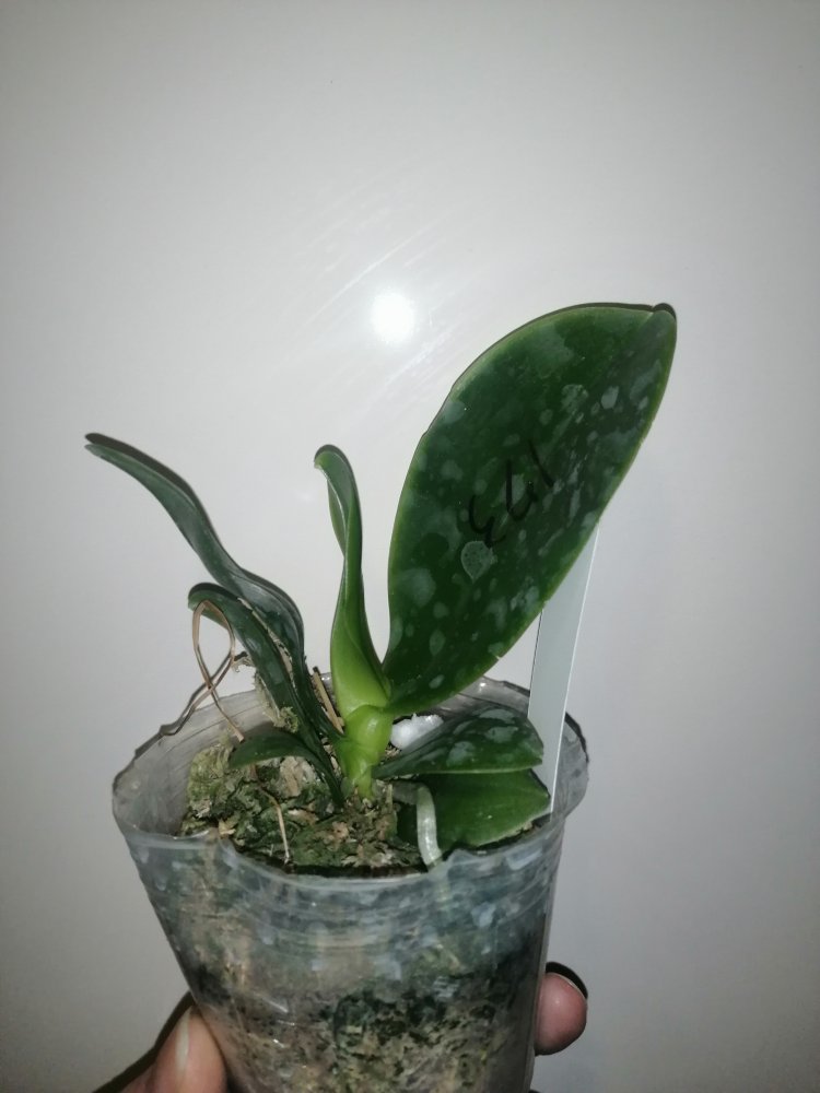 Размер 3,5! Огромная! 3 широкие листа: 20, 20 и 30 см! Тургор незначительно снижен. Мох сухой. Корни чуть высохли, но отопьются. Замят и сломан край у большого листа при упаковке. В остальном прекрасная орхидея за такую небольшую цену. Спасибо Пассифлора.