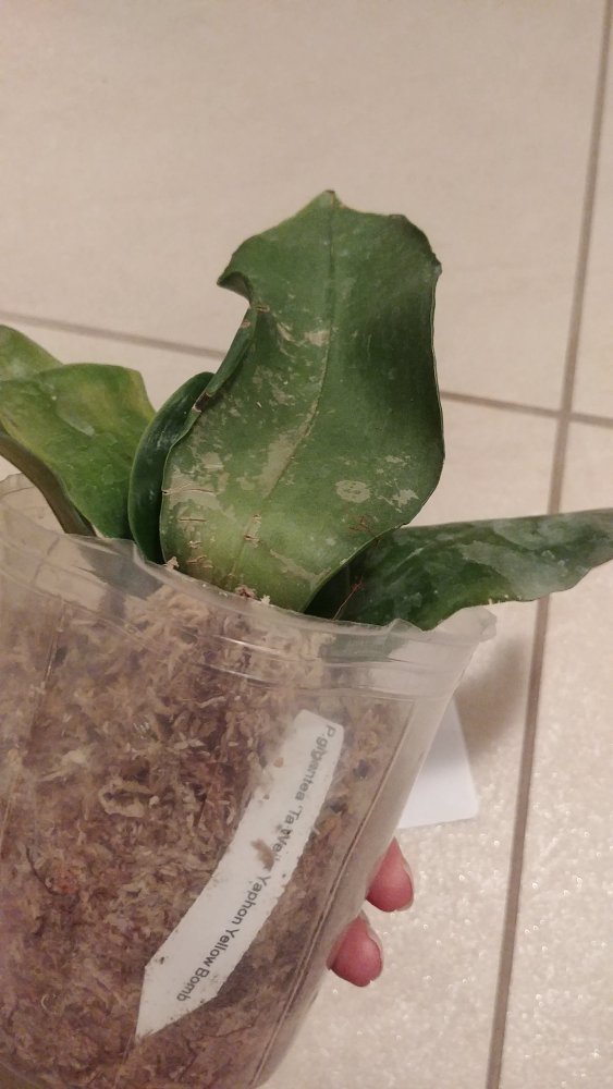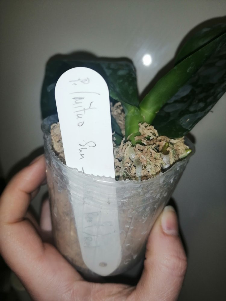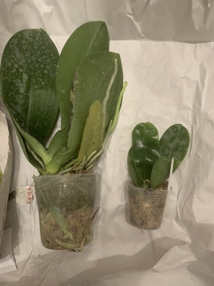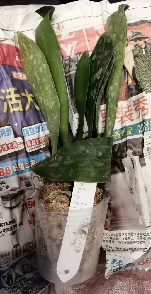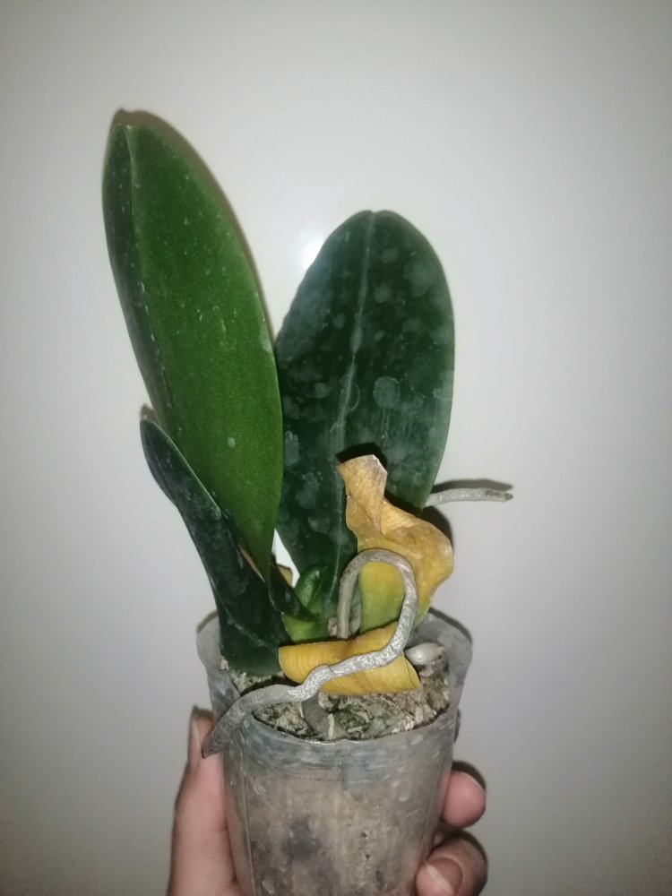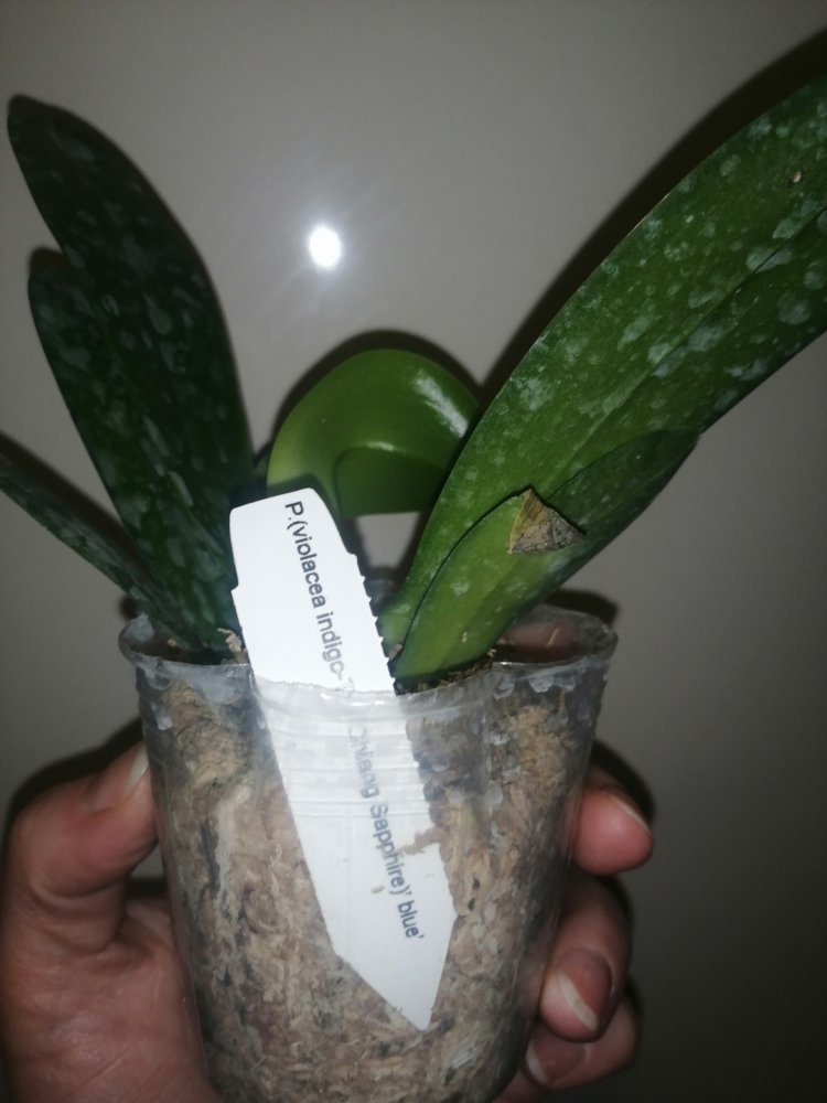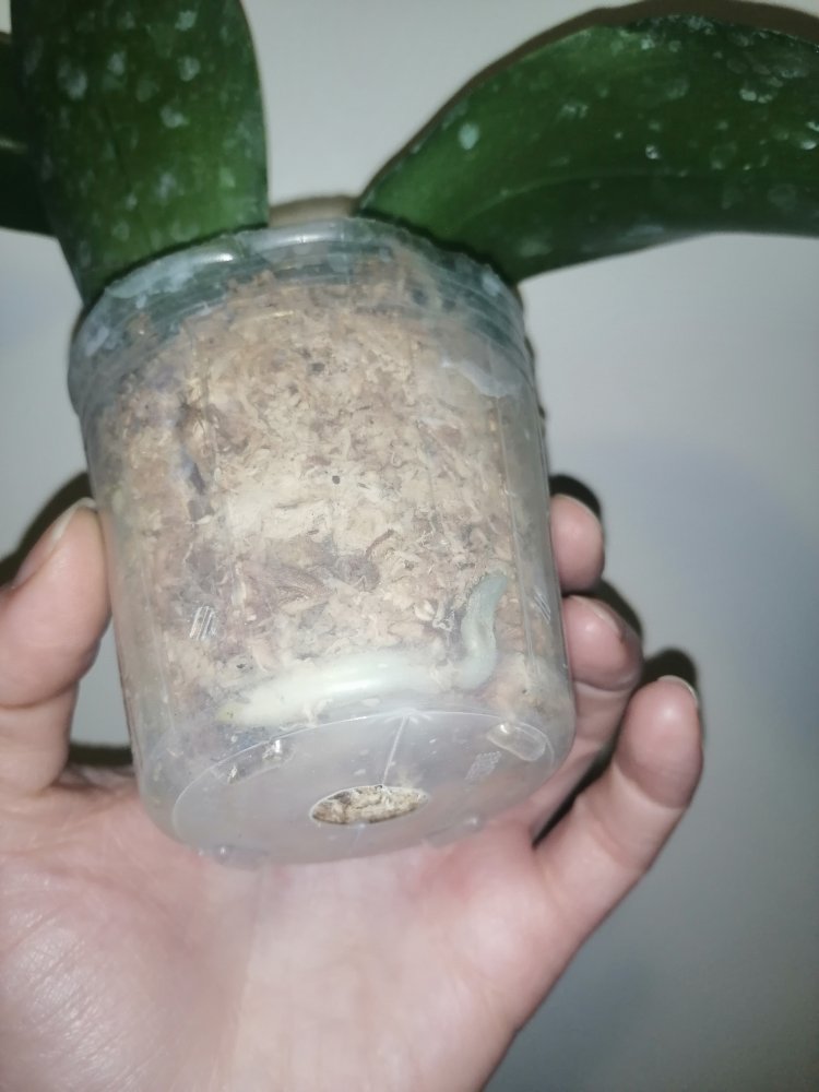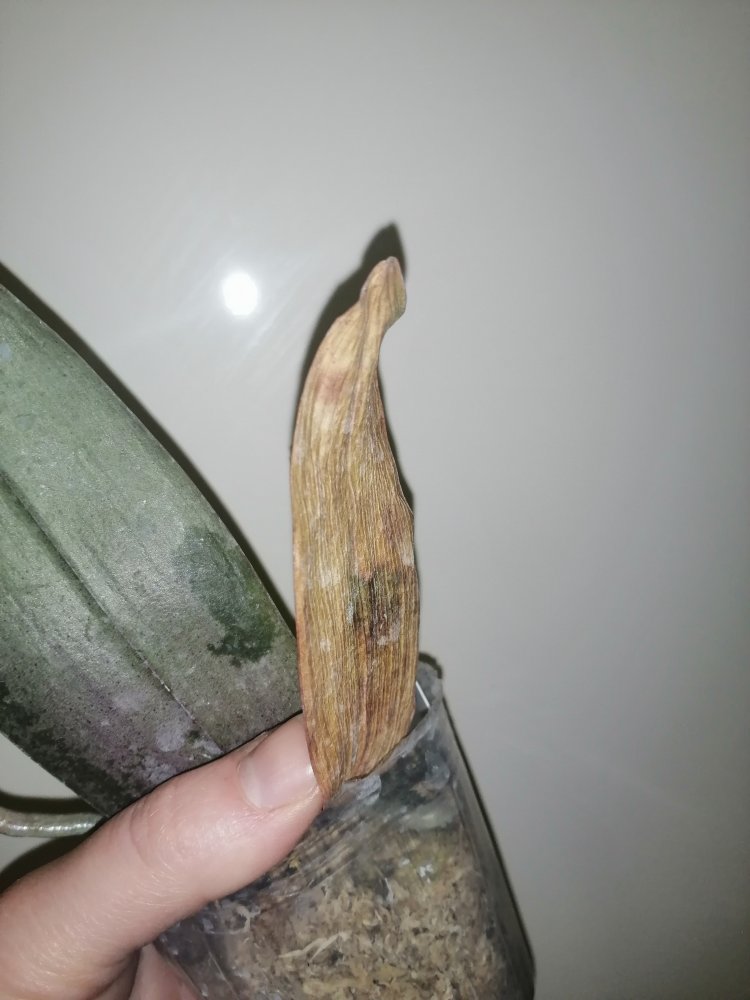 Размер 3,5! Огромная! 3 широкие листа: 20, 20 и 30 см! Тургор незначительно снижен. Мох сухой. Корни чуть высохли, но отопьются. Замят и сломан край у большого листа при упаковке. В остальном прекрасная орхидея за такую небольшую цену. Спасибо Пассифлора.