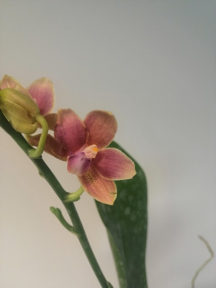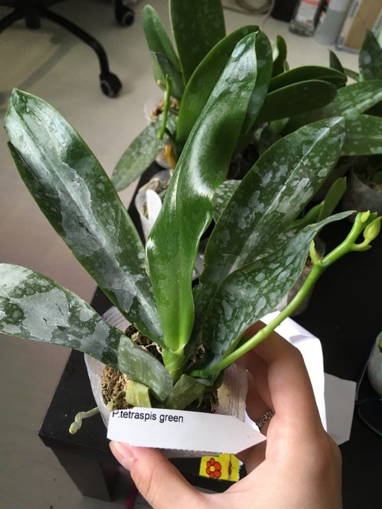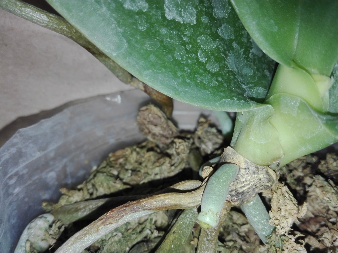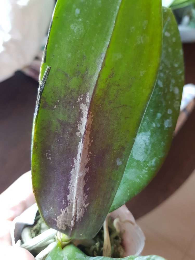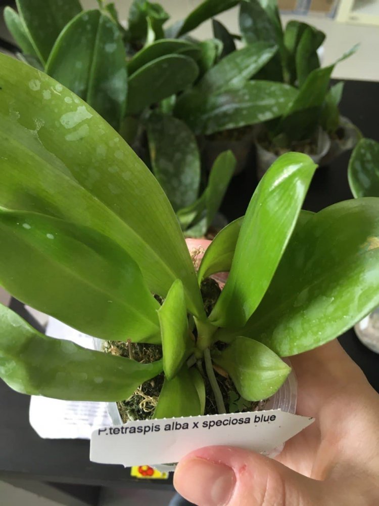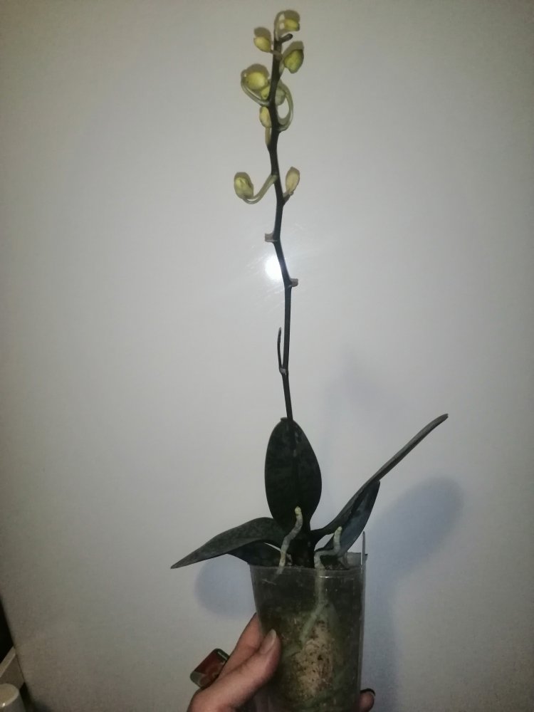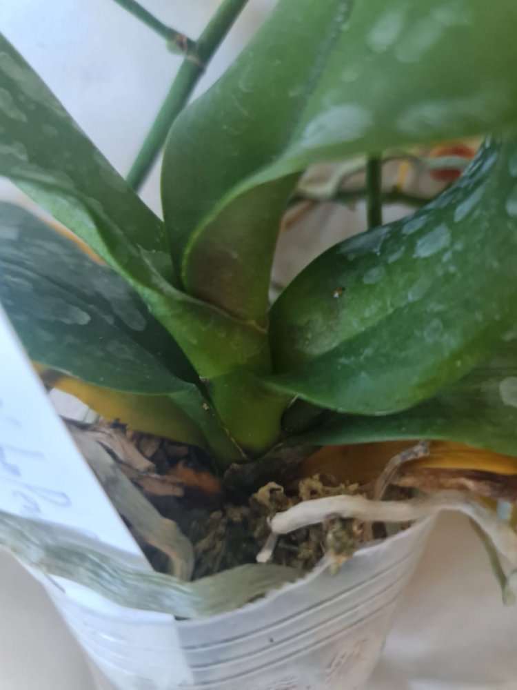 Размер 3,5! Огромная! 3 широкие листа: 20, 20 и 30 см! Тургор незначительно снижен. Мох сухой. Корни чуть высохли, но отопьются. Замят и сломан край у большого листа при упаковке. В остальном прекрасная орхидея за такую небольшую цену. Спасибо Пассифлора.