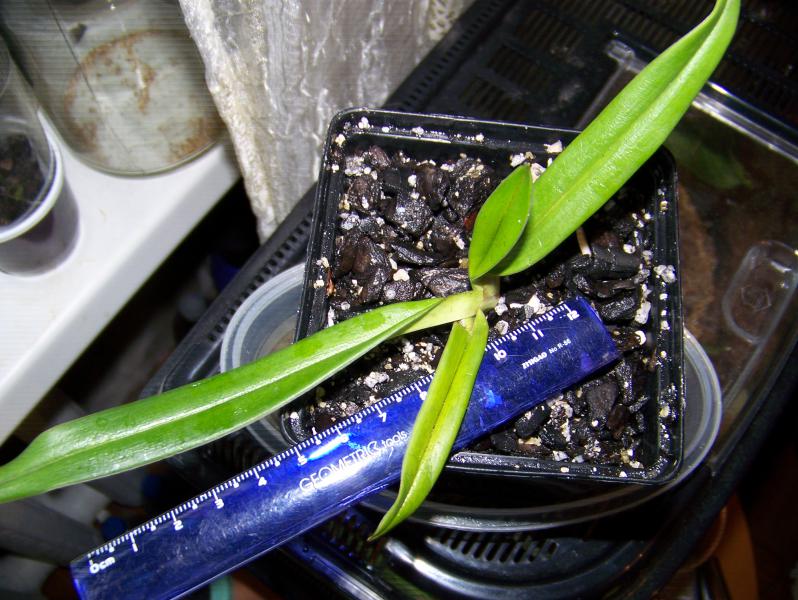 Ну так вот ковач, который год-полтора из фласки. Через несколько дней после посадки. Линейка лежит рядом с самым большим листом, по факту сама растень выглядела очень маленькой и хилой))) Это 8-см горшок.