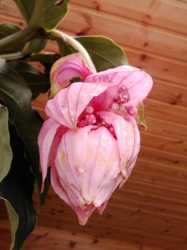 Светило, у меня была мединилла. Такая же ерунда с листьями. Поначалу думала вредители какие, все обрабатывала ее химией, толку ноль. Потом стала просто раз в неделю в душ таскать и каждый листочек промывать. Но у меня крупинки больше на сахар были похожи. А так росла отлично, цвела постоянно. Но я от нее устала безумно. Постоянно весь пол под ней был усыпан мелкими розовыми ошметками. По содержанию - посадила в высокий пластиковый горшок, как для цимбидиумов. И его вставила в подходящее кашпо, тоже высокое и очень тяжелое. Т.к. растение огромное, чтобы противовес был. Грунт намешивала сама. Основная масса - готовая почвенная смесь для фиалок (Вот точно какая не помню, давно было, но только она понравилась), потом примерно столько же по объему готового субстрата для орхидей Компосана (с крупной корой и волокнистым торфом), чуть угля, кажется крошила туда кокосового торфа немного, и удобрение Суперфосфат из расчета чайная ложка на литр субстрата. Поливала часто, просыхать давала редко. Часто опрыскивала листья. Она очень любит высокую влажность воздуха, иначе листья мельчают, да и сама она чахнет. Стояла на ярком свете, но за тюлем. Так росла у меня пару лет, исправно цвела, пока ее раз ветром из окна не повалило. Вся переломалась и стала погибать, спасти я ее уже не смогла.