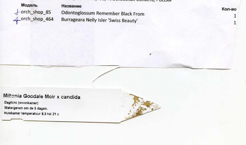 Вчера поздно вечером и я забрала свой заказик, одонтоглоссум и бурагеару (вернее я ждала бурагеару ) . И в распечатке она, замен нет. А вот вживую в заказе оказалась мильтония, которая мне совсем-совсем не нужна. К качеству претензий нет. Одонтоглоссум, как и предполагалось цветущий, правда скоро отцветет, но это не важно.