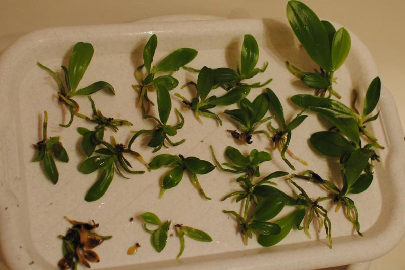 Положила сушится на час, потом посадила в кору со сфагнумом. Самых крупных по одному, остальных по 2-3 и больше. Самых мелких сажала в чистый сфагнум. Горшочки поставила в тепличку на влажный карамзит.