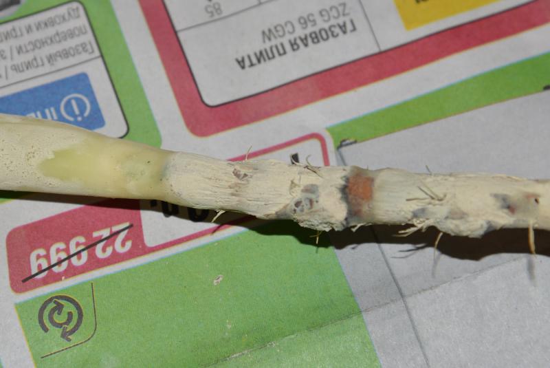 Милка13, Пахнуть гнилью могут остатки сопревших и как следствие этого подгнивающих листьев. Я считаю, что у Маркизы получалась уникальная вещь! От такого обрубочка отрастить корни! У меня лично такого ни разу не получилось. В общем, мое мнение, которое Вы можете учесть, а можете и пропустить мимо, ведь это Ваша ванда... Опрыскиваете корни раствором гамаира и алирина, чуть подсыхают, чтобы не капало с них, переворачиваете вниз головой, опрыскиваете ботву. Феном пользоваться в данный момент не стоит, раствор должен впитаться и подействовать. Весь ствол до чистого места замазываете кашицей из этой же смеси. Через день замачиваете корни в чистой воде минут на 10, не больше. Ботвы осталось мало, хватит за глаза и за уши. На следующий день повторяете опрыскивание только корней и только ботвы, аккуратно, чтобы лишняя влага на ствол не попала. И смотрите. Если все растение поражено, нижние листья пожелтеют... При больном стволе запах своеобразный, это даже не гилью пахнет, а не знаю с чем сравнить. И правильно Ирина Баринова написала, гнилой ствол мягкий. Если обрезать по красным линиям, нет запасов ствола. Если примите решение обрезать, то для начала хотя бы см на 7-10 ниже. И смотрите - чистый или нет, и не появится ли через минут 18-15 фиолетовые кружочки. И тогда будете потихоньку резать выше, инструменты обязательно перед каждой манипуляцией надо дезинфициоровать. Постараюсь вечером сфоткать одну из таиландских ванд, там тоже длинный голый ствол, желто-коричневый, без корней и без листьев. И ничего, не гниет, растит листья потихоньку, цветет себе...