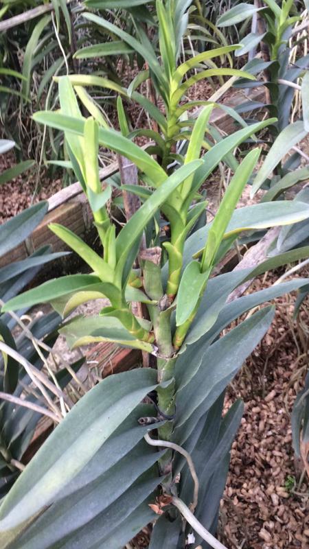 Высота помещения примерно 2,70, нагреватель под самым потолком. Эта ванда висит примерно на высоте 1,6 от пола, но не прямо под нагревателем. Есть растения, гораздо ближе к нему. Температура выставляется терморегулятором. Максимальная-25 градусов, потом отключается и автоматически ее поддерживает. Ночью отключаю, ставлю на 15 градусов, но обычно ниже 17 пока не опускалась. Каттлеи в том же помещении отлично цветут сейчас, у ванд-соседок этой растут цветоносы.