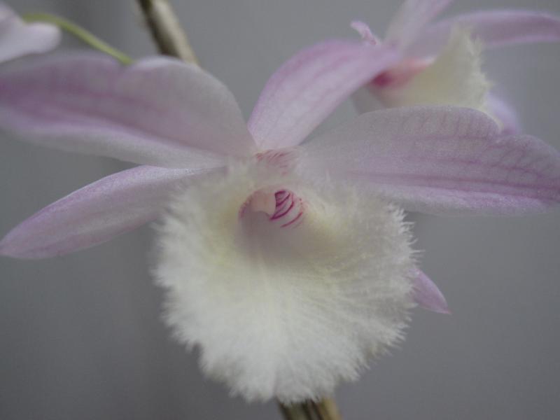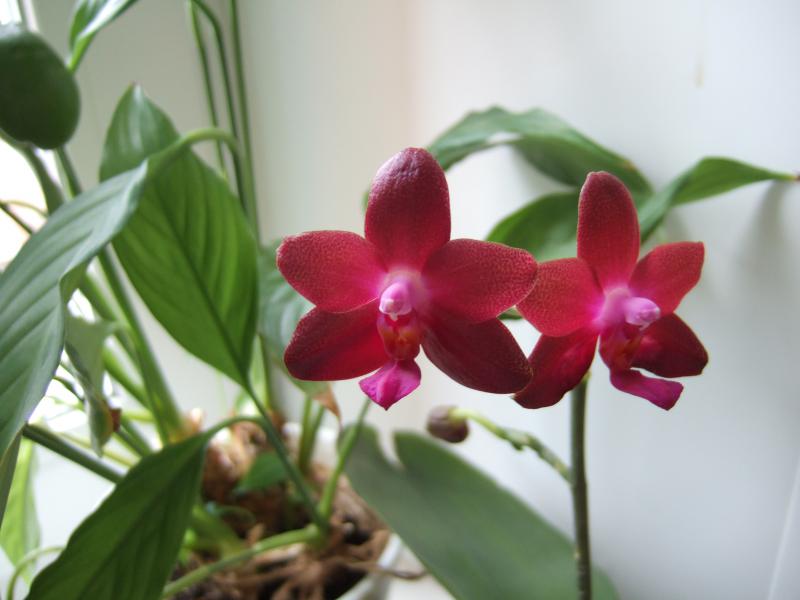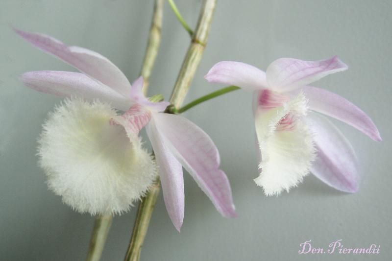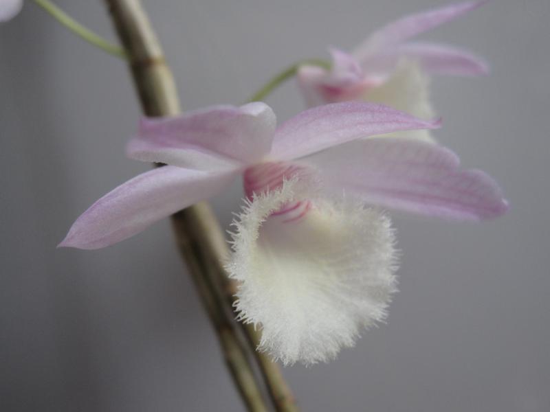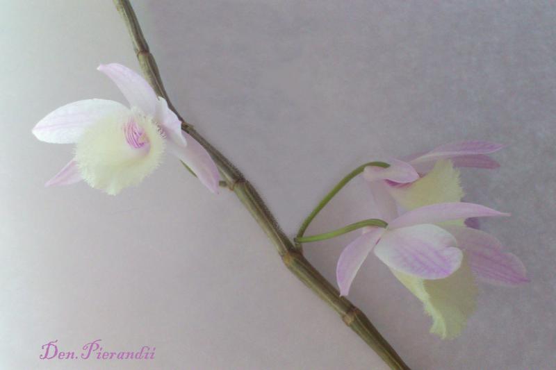 В конце декабря 2014 получила Den. Pierardii из YihCheng. Единственные два листочка быстро отлетели и остались две палочки (самая длинная – 52 см). Через полтора месяца появились маленькие почки и растение было переставлено на окно, где в первой половине дня солнце. Скоро поняла, что это всё же бутоны. Не думала, что мой прутик так быстро зацветёт))) Цветение пока не пышное – всего 4 цветочка. Но очень милые. На 3-й день появился слабый приятный аромат. Кроме того на верхушке показался новый побег с малюсеньким корешком.