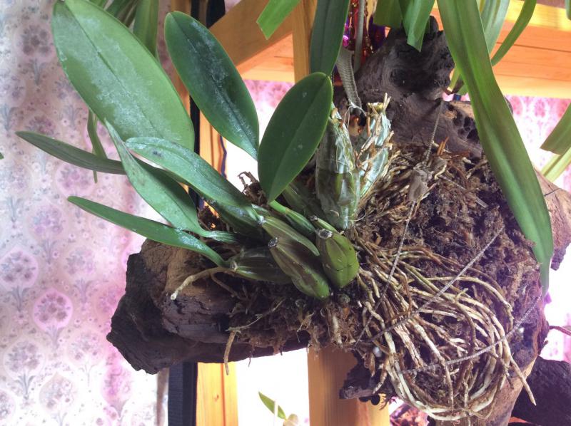 Долго думала, пересадить сразу или оставить в родном мху, но решила не тревожить растение. На самых крупных бульбах были следы от цветоносов. Недели через 3 после прихода растения, я его отпоила, он надул бульбы, и я его отправила на прохладный подоконник, на естественное освещение. Так он и сидел всю зиму, в конце марта полила и пересадила на блок. Честно говоря, это первое растение , которое я садила на блок. Мох, в котором он сидел я подложила на блок.