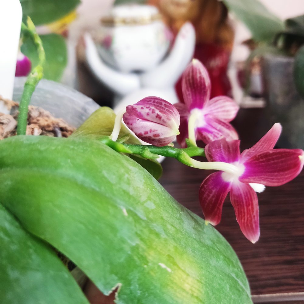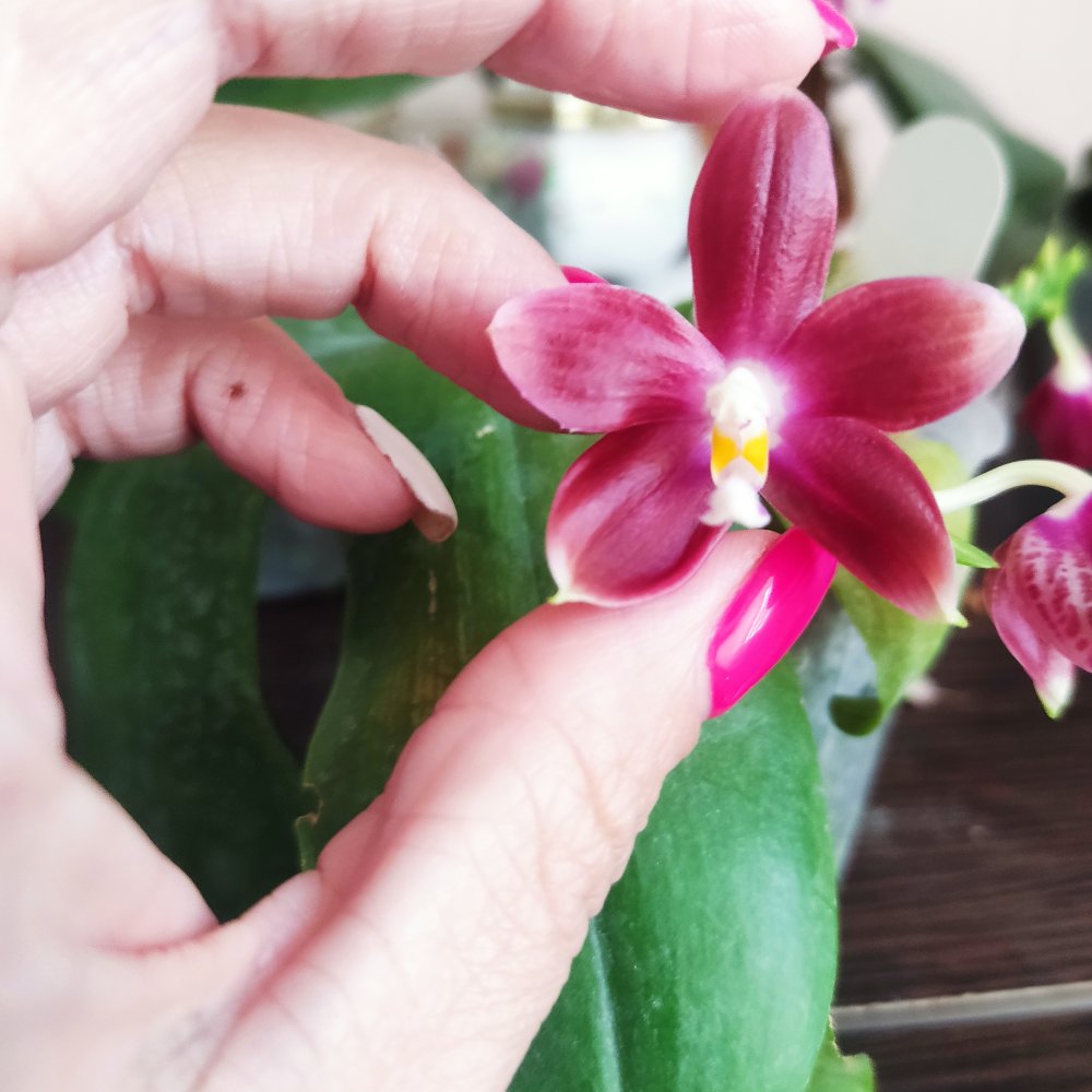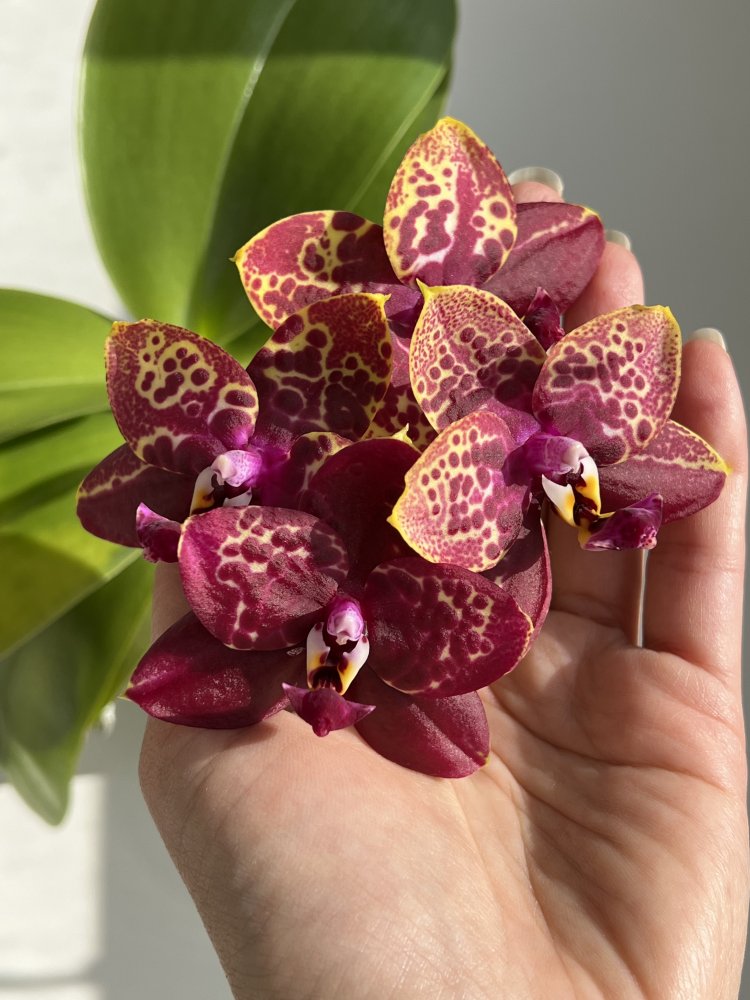 И все 4 цветочка у Phal. Yaphon Black Rose BKM-13, четвёртый бутон формировался уже под лампами, поэтому наглядно видно как отличается окраска