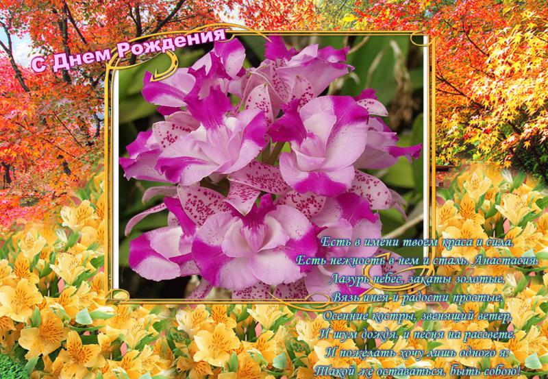 Поздравляю Вас, Анастасия! Поздравляю Вас от всей души. Оставайтесь Вы всегда красивой, С сердцем добрым и большим. И сколько бы не миновало лет, Желаю, забегая наперед, Чтоб Вам всегда звучало вслед: Какая женщина идет!