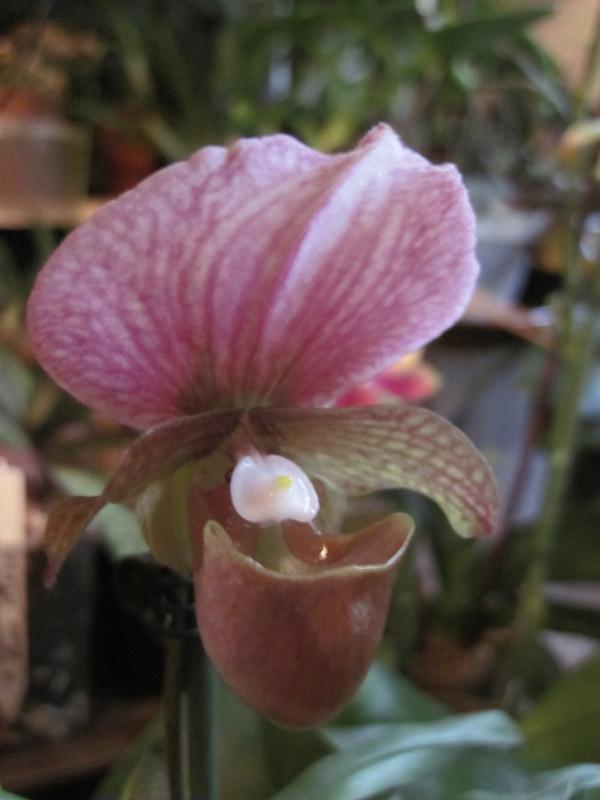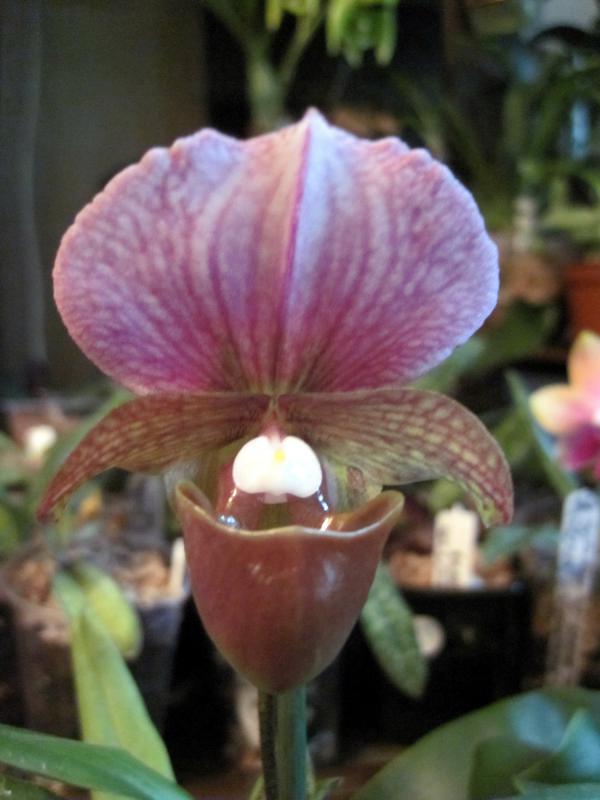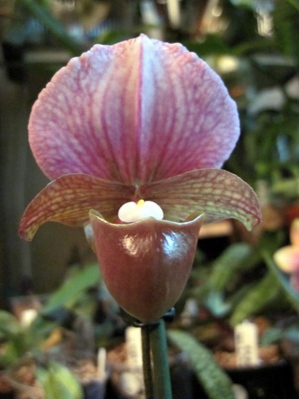 Paph Harold Koopowitz (rothschildianum x malipoense) розетка компактная, примерно 25-30 см, на фото видно, при этом высокий цветонос ми крупный цветок.