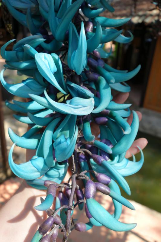А растение сине-зеленое, это так называемая Нефритовая лоза (Strongylodon macrobotrys). Ну это если наш интернет не врет))) Удивительный исчезающий вид с филиппинских островов , который опыляют летучие мыши.