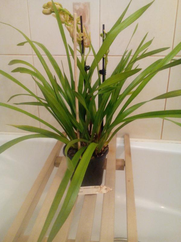 Cymbidium Gem Stone. Получила большой цветущий куст - 4 взрослые бульбы с листьями и 2 новых роста. Пересаживать не стала, немножко покопала пальцем кору - много живых корней. Придраться не к чему - растение идеально. Большое спасибо за заказ!