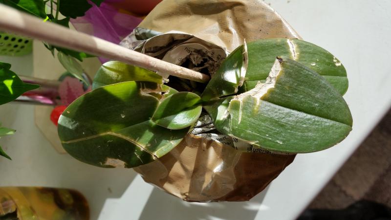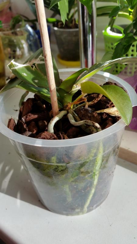 Phal. Princess Kaiulanii flava x sib - ботва в смятку (такое ощущение, что на нее ставили что-то тяжелое), целых листьев нет, что с точкой роста - не понятно. На то, что выживет особо не рассчитываю.