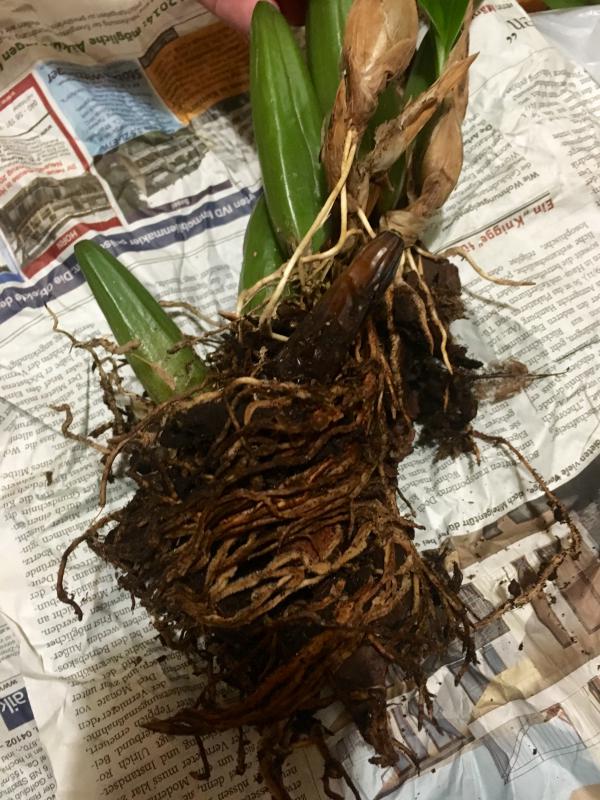 Много бульб, есть новые росты. Корни в основной массе сухие, "бороду" пришлось отстричь. Будем растить новые. Этот дендр и не цветущий хорош!