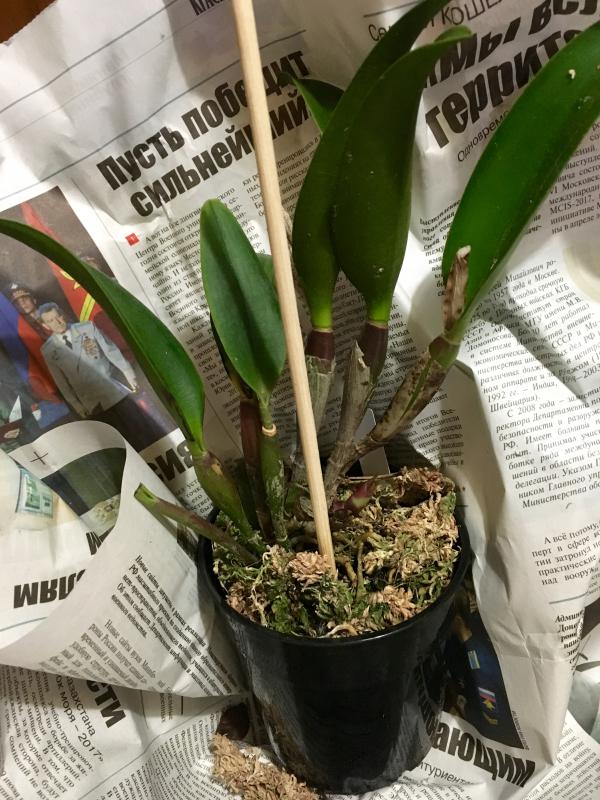 Стройная красивая каттлея,пришла с ОКС ,есть новый рост и один маленький живой корешок, остальные полностью высохшие,вредителей не видно