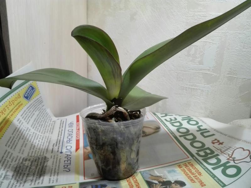 7 очень сочных, бодрых листьев! Засохший цветонос совсем небольшой по длине, воздушные корни живые, корни в горшке живые, но раскопок пока не проводила. Размер 2,5 хороший. Вредителей нет, заказом очень довольна!
