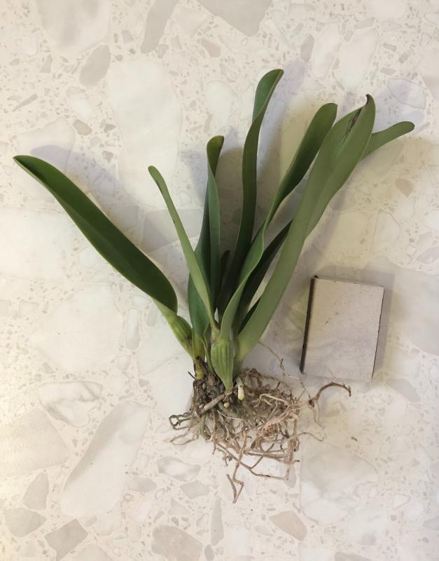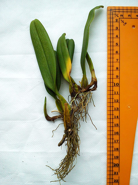 C. Dowiana Aurea. Каттлея с ОКС, есть растущие корешки. На некоторых листьях небольшие чёрные пятна.