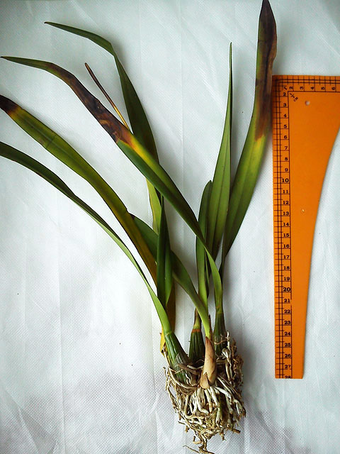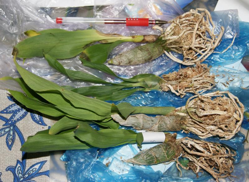 Четыре чуть сморщенные бульбы, две из которых цветшие, другие две с проклюнувшимися цветоносами, одна растущая бульба, сухие корни. Пять листьев подопрели (с плесенью), один сразу же отвалился, когда разворачивал сверток. Высота бульб 5 см, длина листьев - до 32 см.