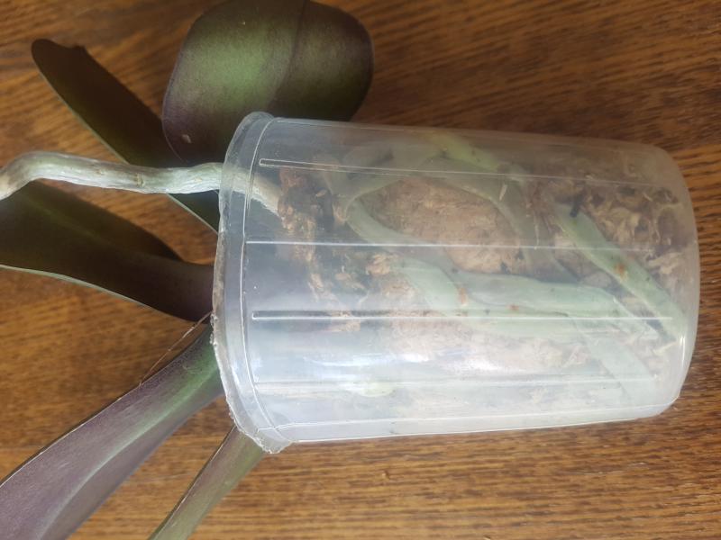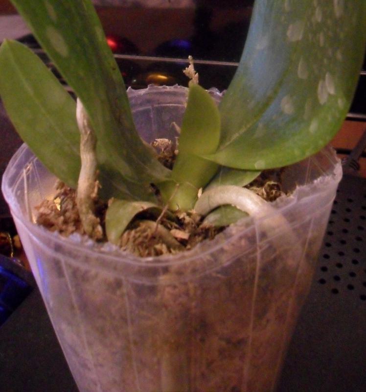 Растение взрослое, цветущее (+ есть отцветший цветонос), 2 точки роста, листья в целом хорошие, пара листьев желтеют. Корней нет (есть один, всё остальное уже даже засохло, покрошилось).