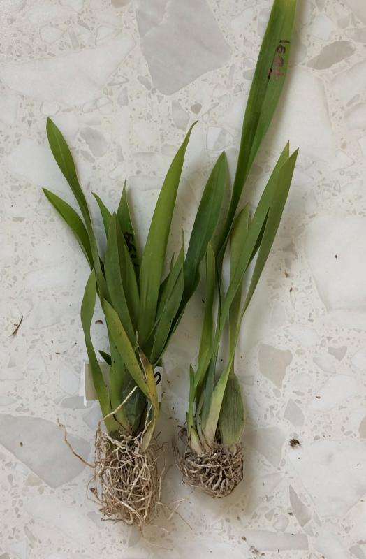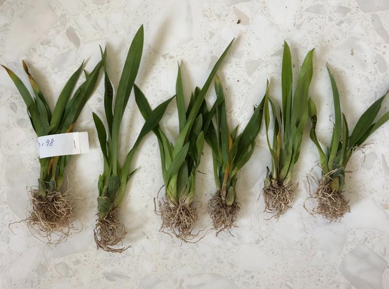 Горшок 2,5, пять бульб в нормальном тургоре, один рост, развитая корневая без растущих кончиков корней, вроде уже цвела. Высота бульб с листьями 12-20 см.