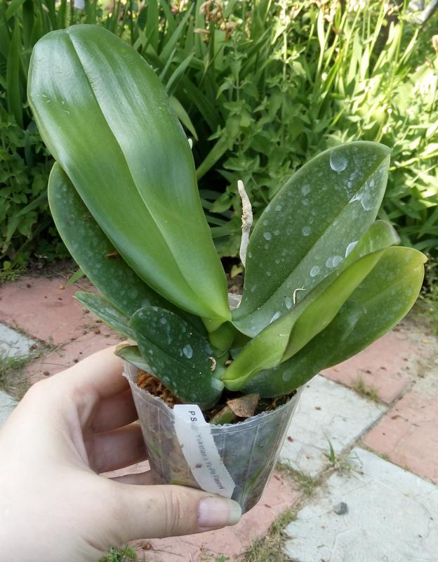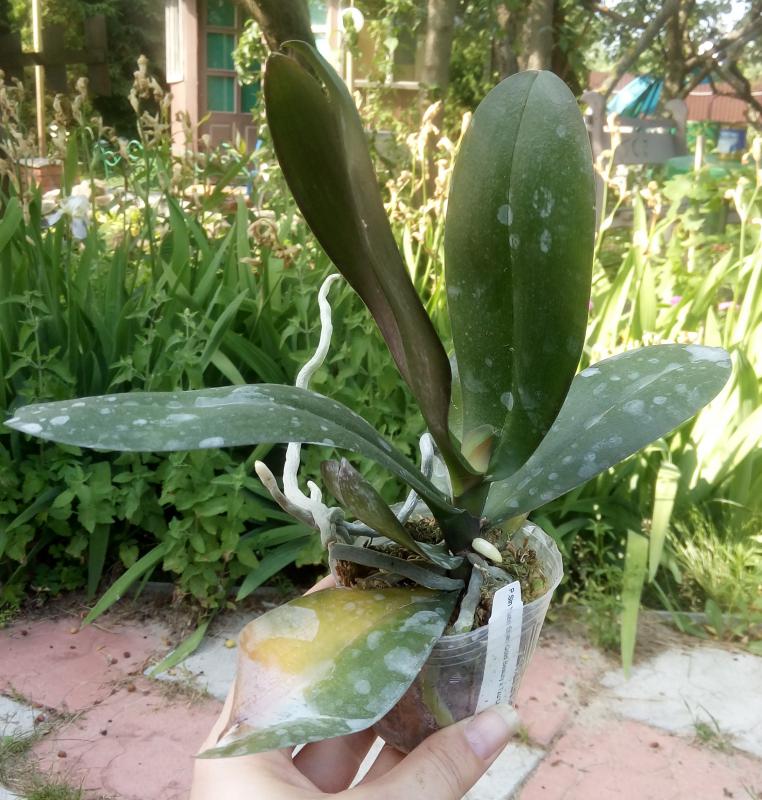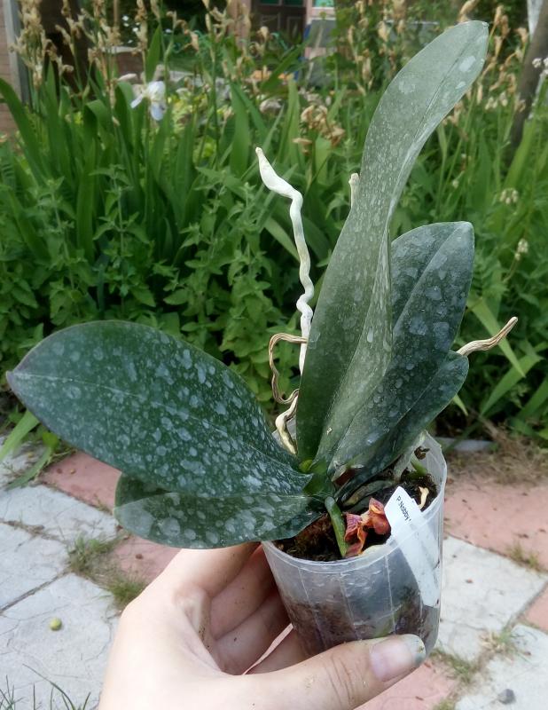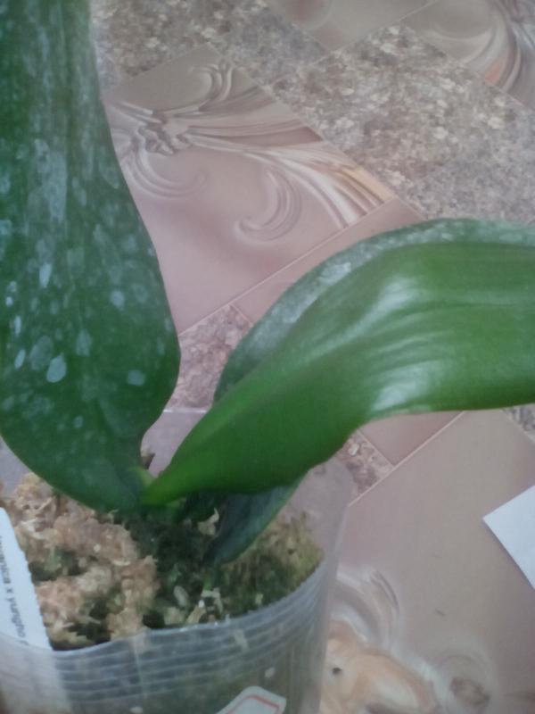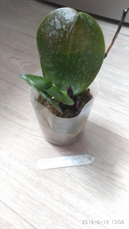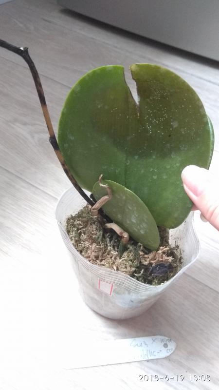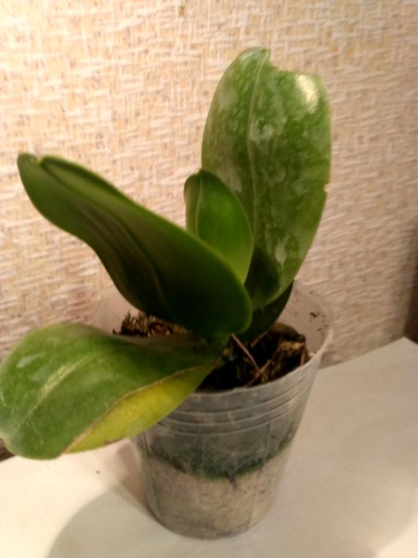 Растение приехало во влажном мхе, с черным засохшим цветоносом, мокрым пятном на одном листе. На мхе валялись отвалившиеся цветочки ( уже засохшие, но с белой плесенью ). Пятно обрезала, присыпала фундазолом, надеюсь что в дальнейшем с растением будет всё хорошо.