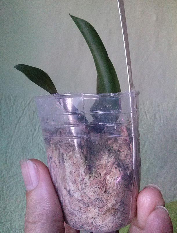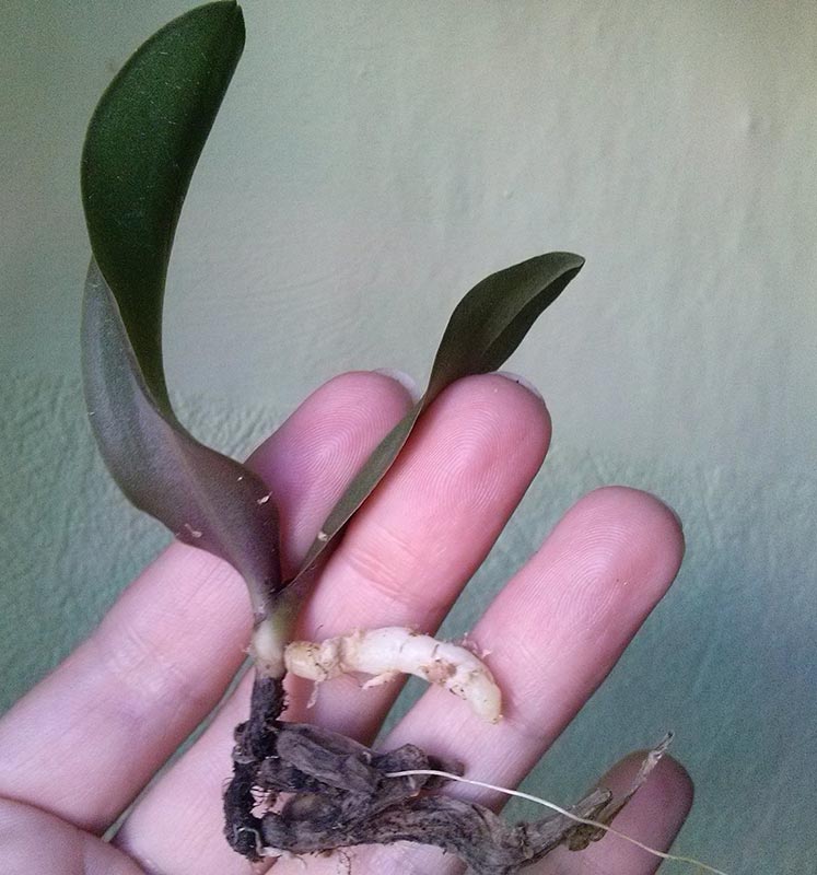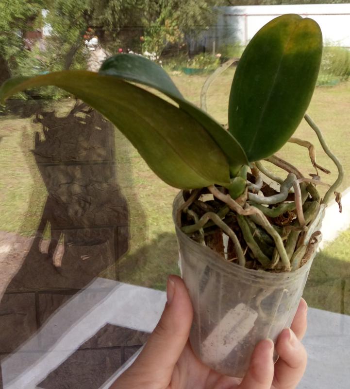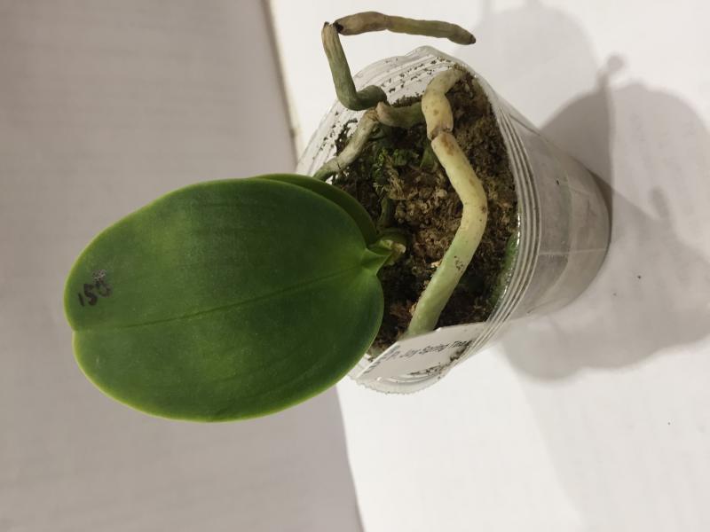 Было заявлено растение 1,7 - пришел микроб о двух листиках, с биркой от POM\Amanda (Phal KS Pride 'Golden Diamond'). Корней сквозь стенки было не видно, пришлось раскапывать. Видеть, собственно, оказалось и нечего: 1 маленький корешок, вплотную к нему гниль. Очень, очень эксклюзивный заказ...