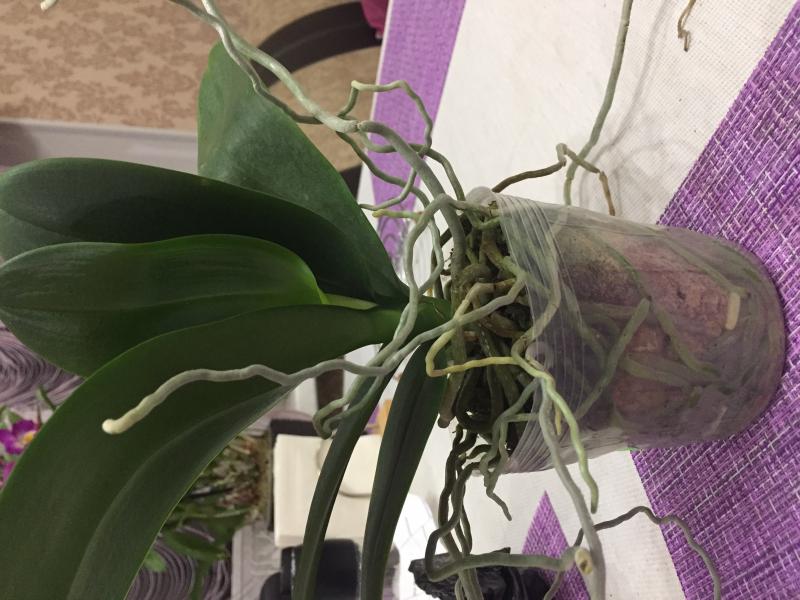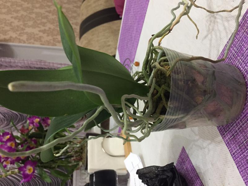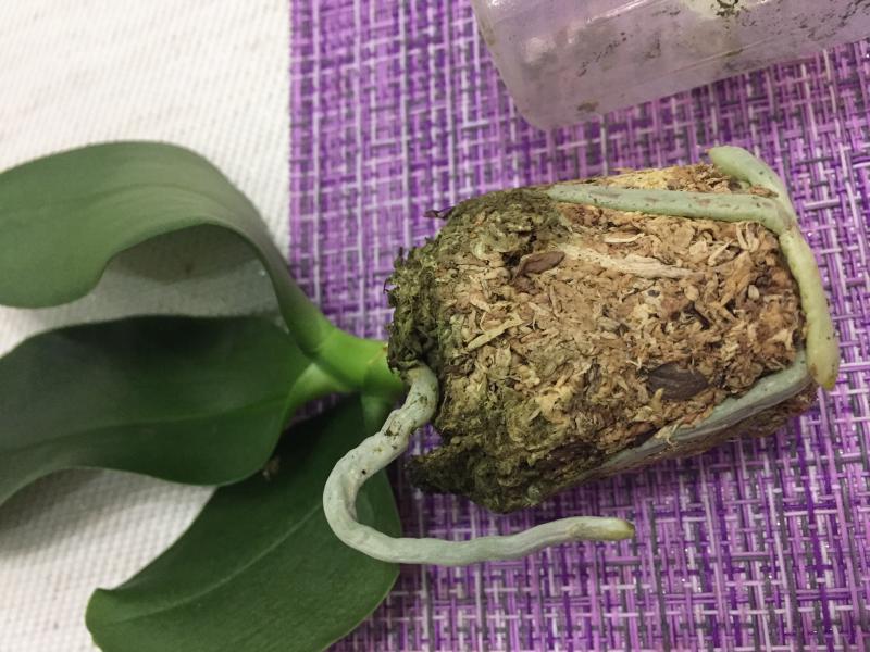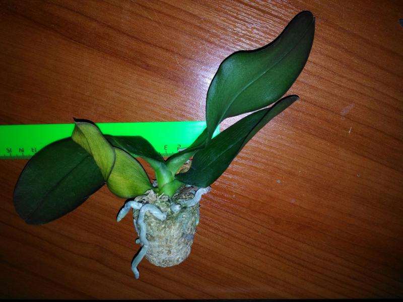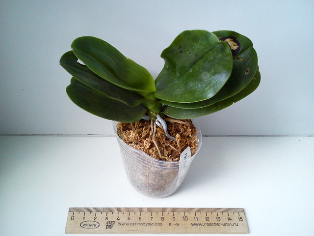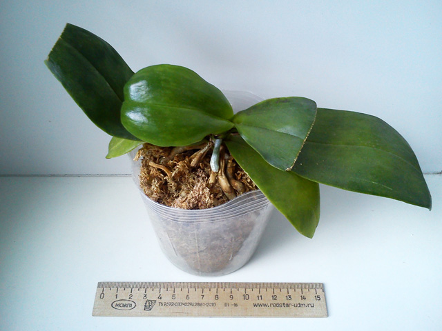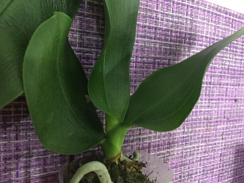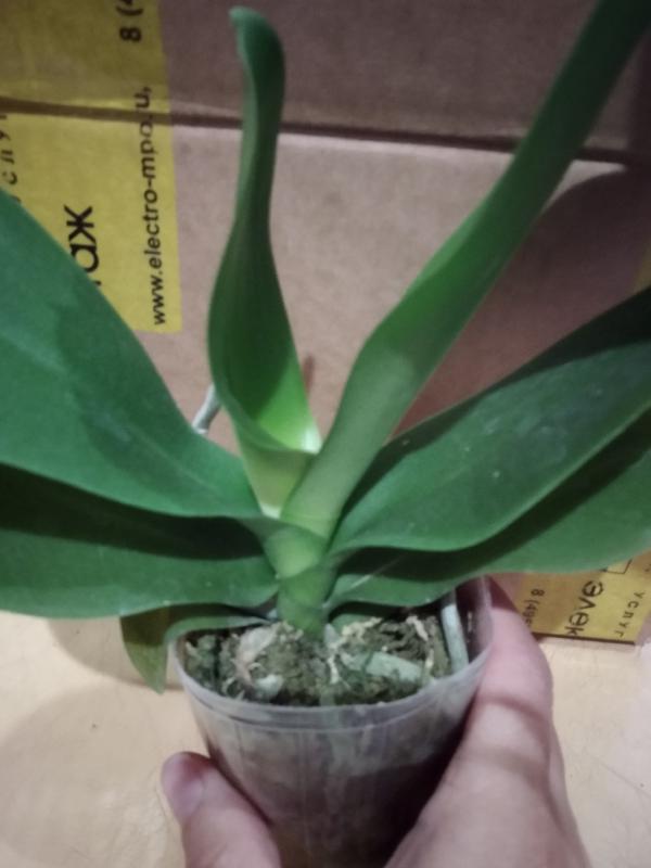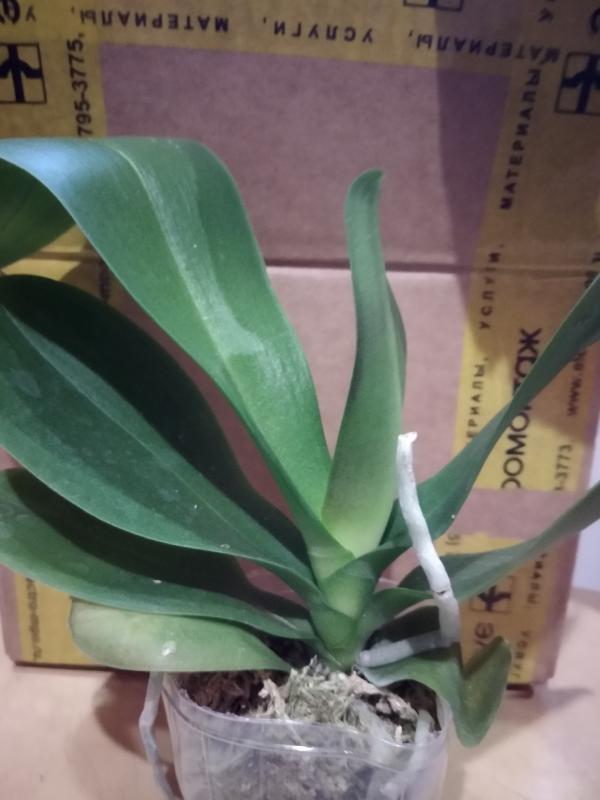 Шикарное растение с цветоносом! Ко мне пришел отцветшим, следы от 3х цветочков. Листиков 4 пары, мох был слегка влажный, еще не пересаживала. Состояние корней не знаю, но сбоку один виден зелененький.