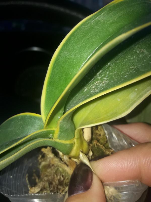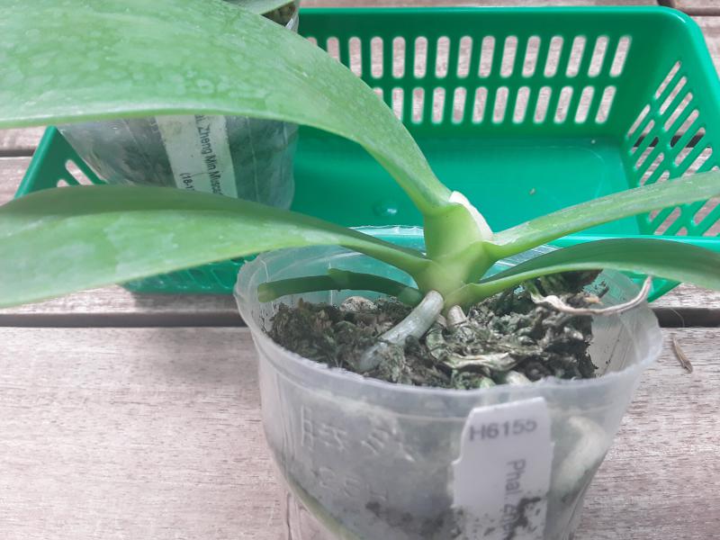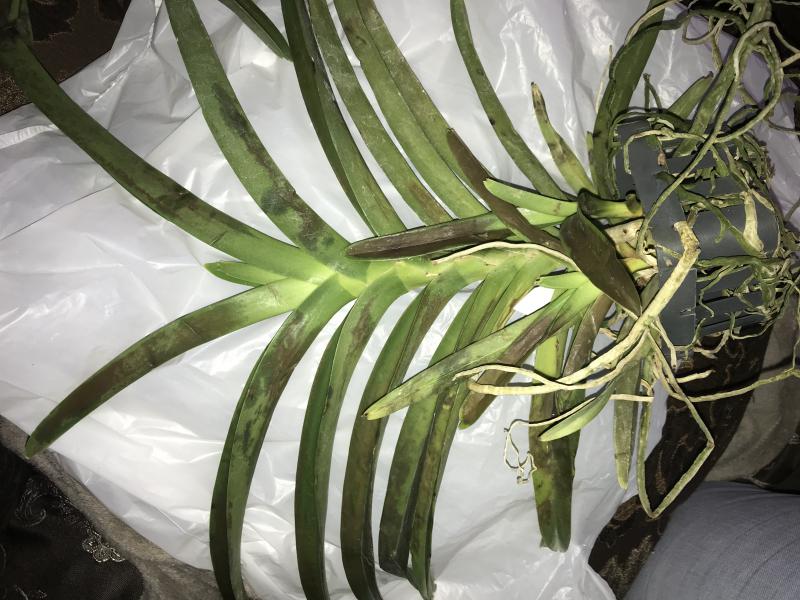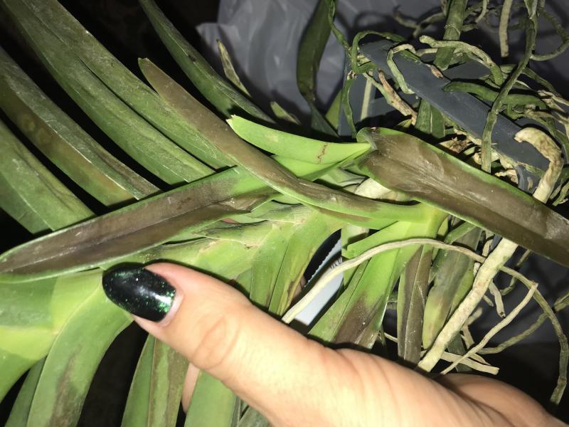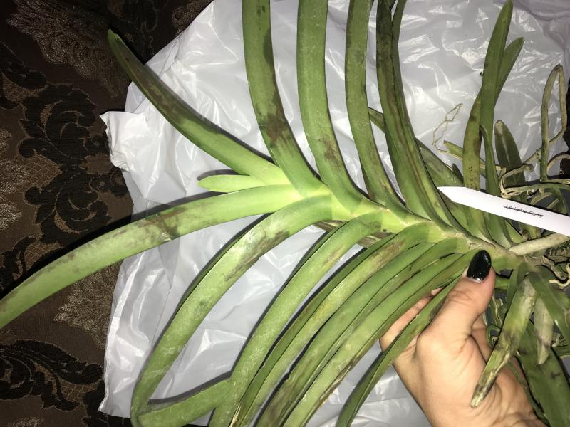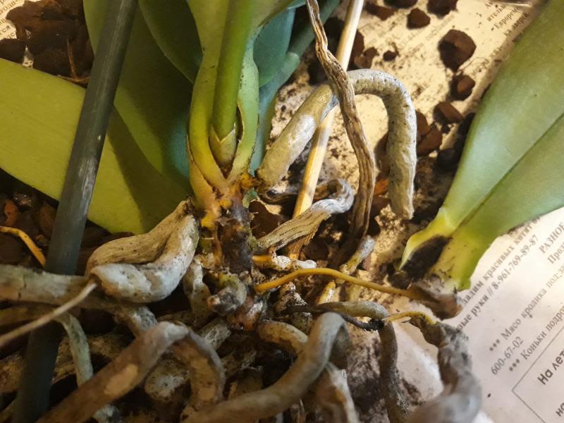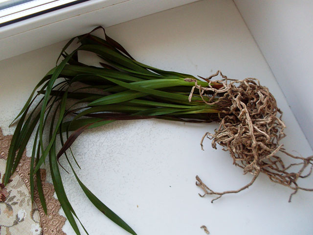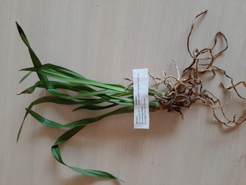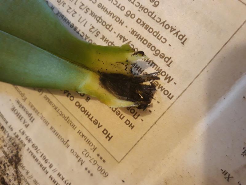 Пересушенная делёнка с бородой из сухих корней (ОКС), две старые сдутые бульбы, две сильно сморщенные "взрослые" бульбы и один рост, листья в сниженном тургоре длиной до 50 см, на листьях темно-зелёный налёт, который легко стирается и при этом пахнет свежей травой (водоросли что ли какие, первый раз такое вижу), больше десяти листьев полностью сухие (отпали при последующей посадке), остатков цветоносов нет. Видимых вредителей нет.