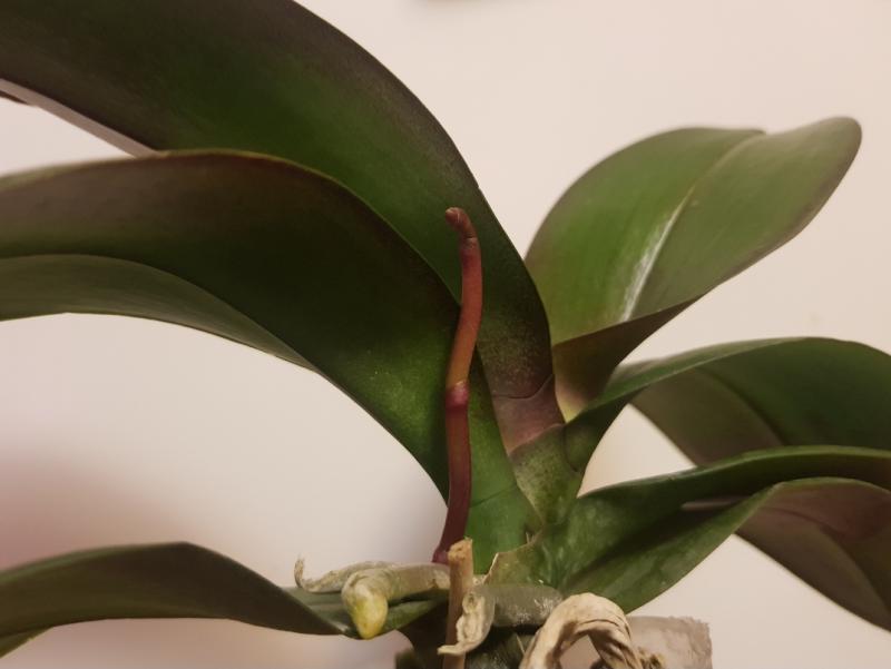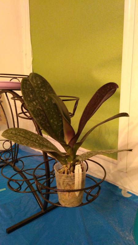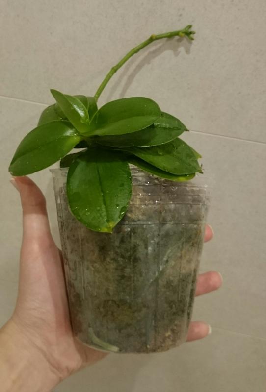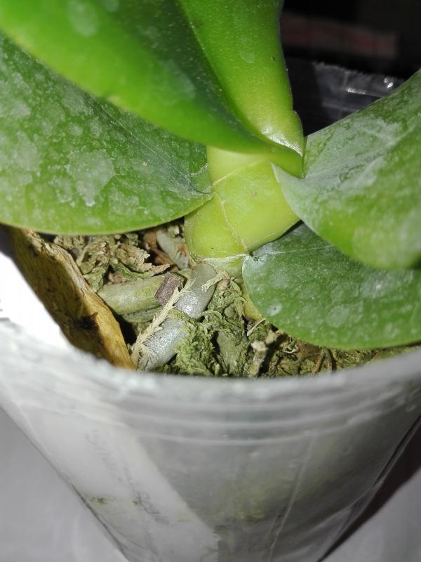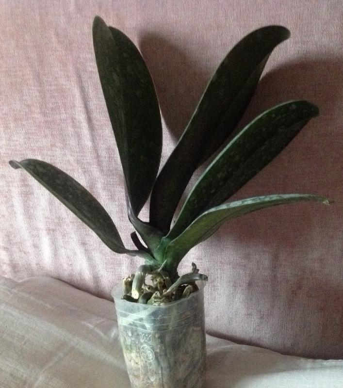 Растение огромное 2,5 со стремлением к 3,0, полный горшок корней (есть молодые растущие), тургор немного снижен (кора совсем сухая, но это плюс, через час после теплого душа все листья стали жесткими и поднялись), есть два срезанных цветоноса-один старый годовалый, второй свежий. Живности и повреждений не обнаружено.