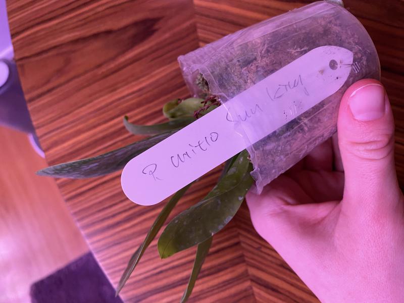 Мох основательно просушен, несколько листьев потеряли тургор, два пожелтели и один имеет механическое повреждение - но это все ерунда, корни живые видны и в целом все хорошо. Присутствует цветная бирка с названием, но информации о поставщике нет.