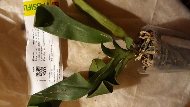 Возможно, сказалось ожидание, но так замять листья ожидание не могло. Видимо, от поставщика растение пришло уже в таком состоянии. Молодой листочек обрезан (на фото этого не видно - лежит другим боком), часть корней сухая.