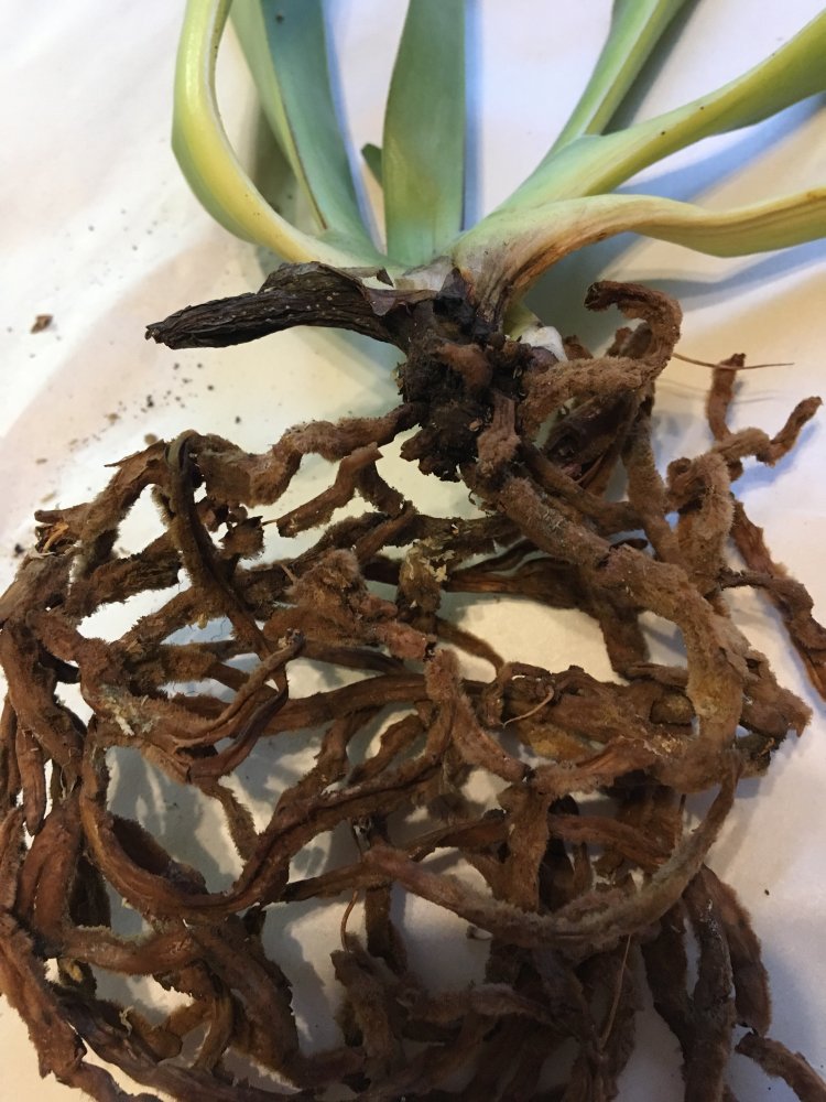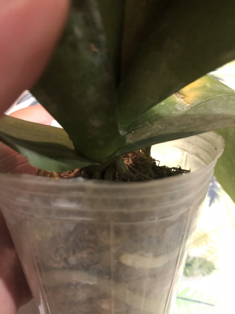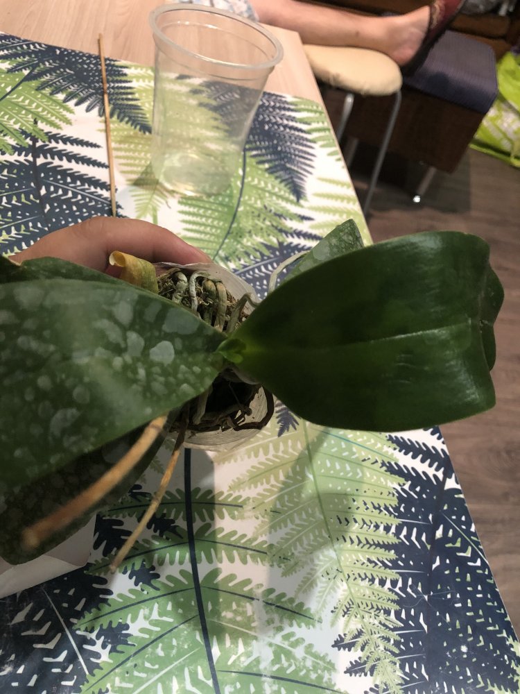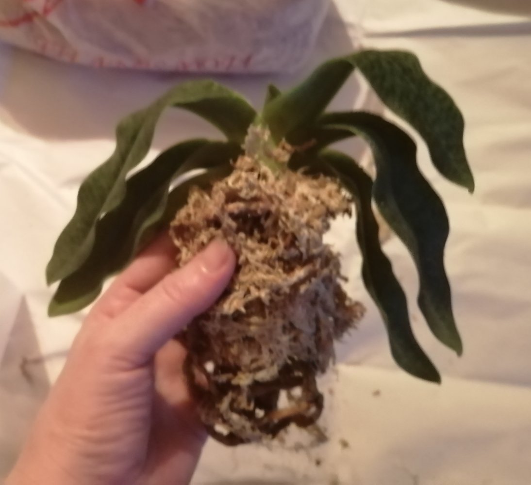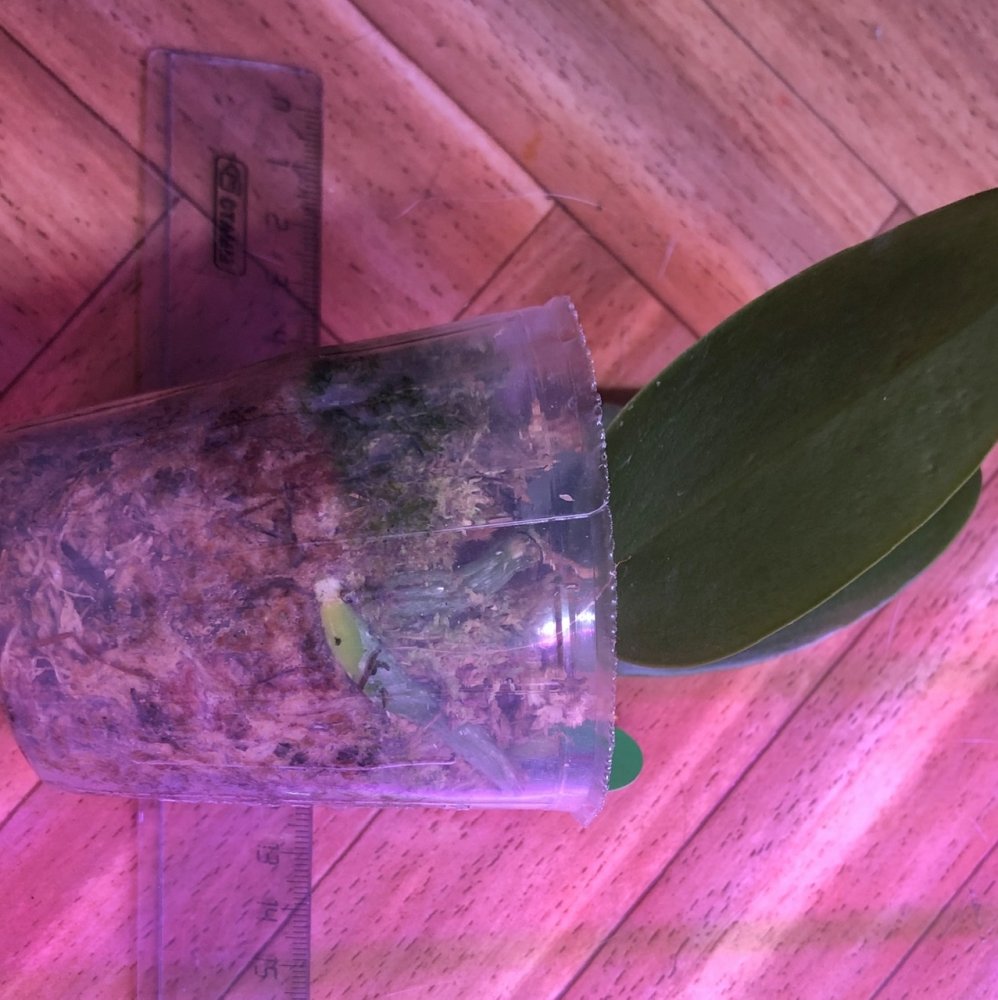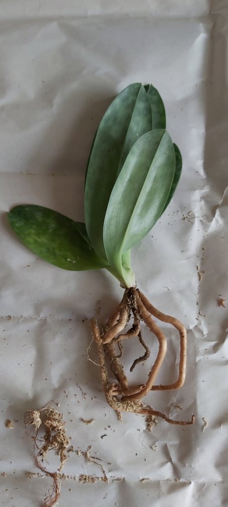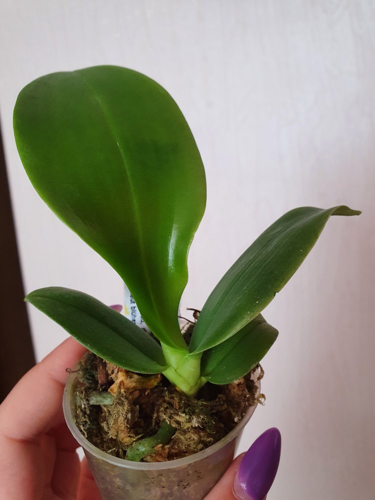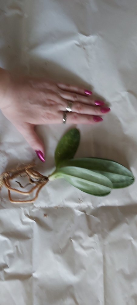 Корешки хорошие.Листья в тонусе,думается размера цветения.Есть небольшой отёк.Очень довольна.Но,растение без бирки,без каких либо опознавательных знаков.Он ли?