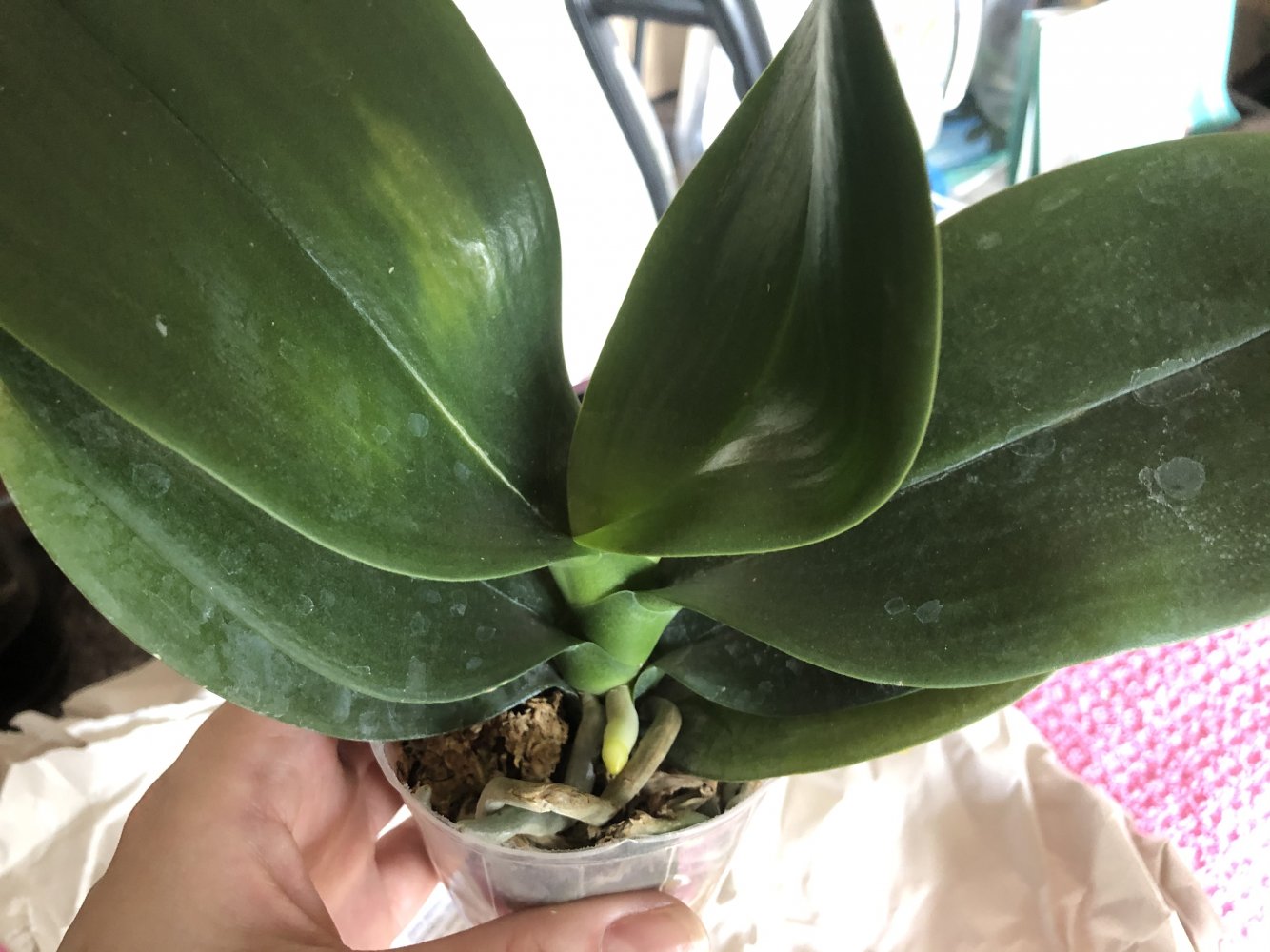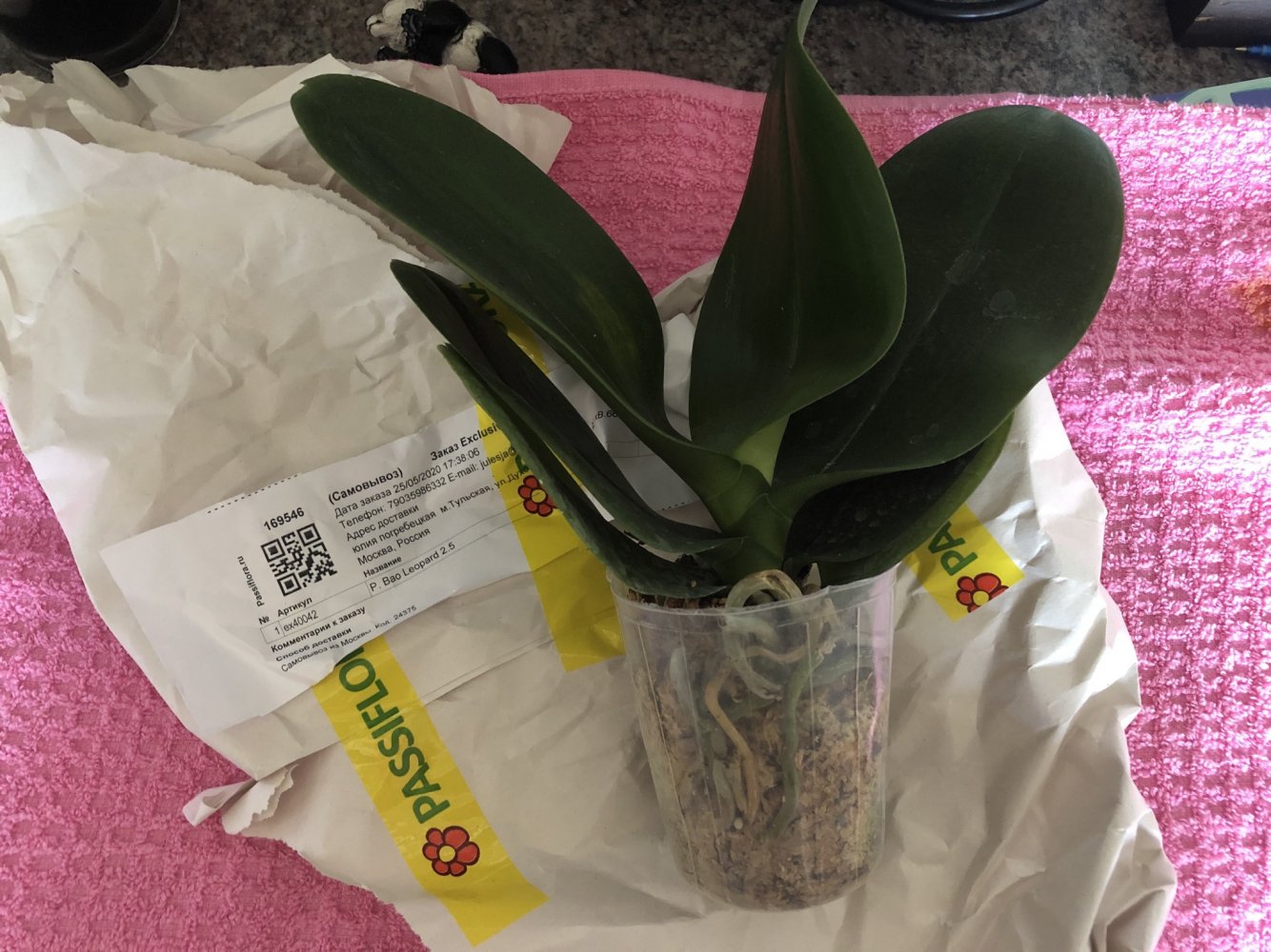 Фаленопсис пришел в горшочке 2,5, но само растение соответствует скорее 1,7. Мох сухой, корни видны, листья целы, вредителей нет.
