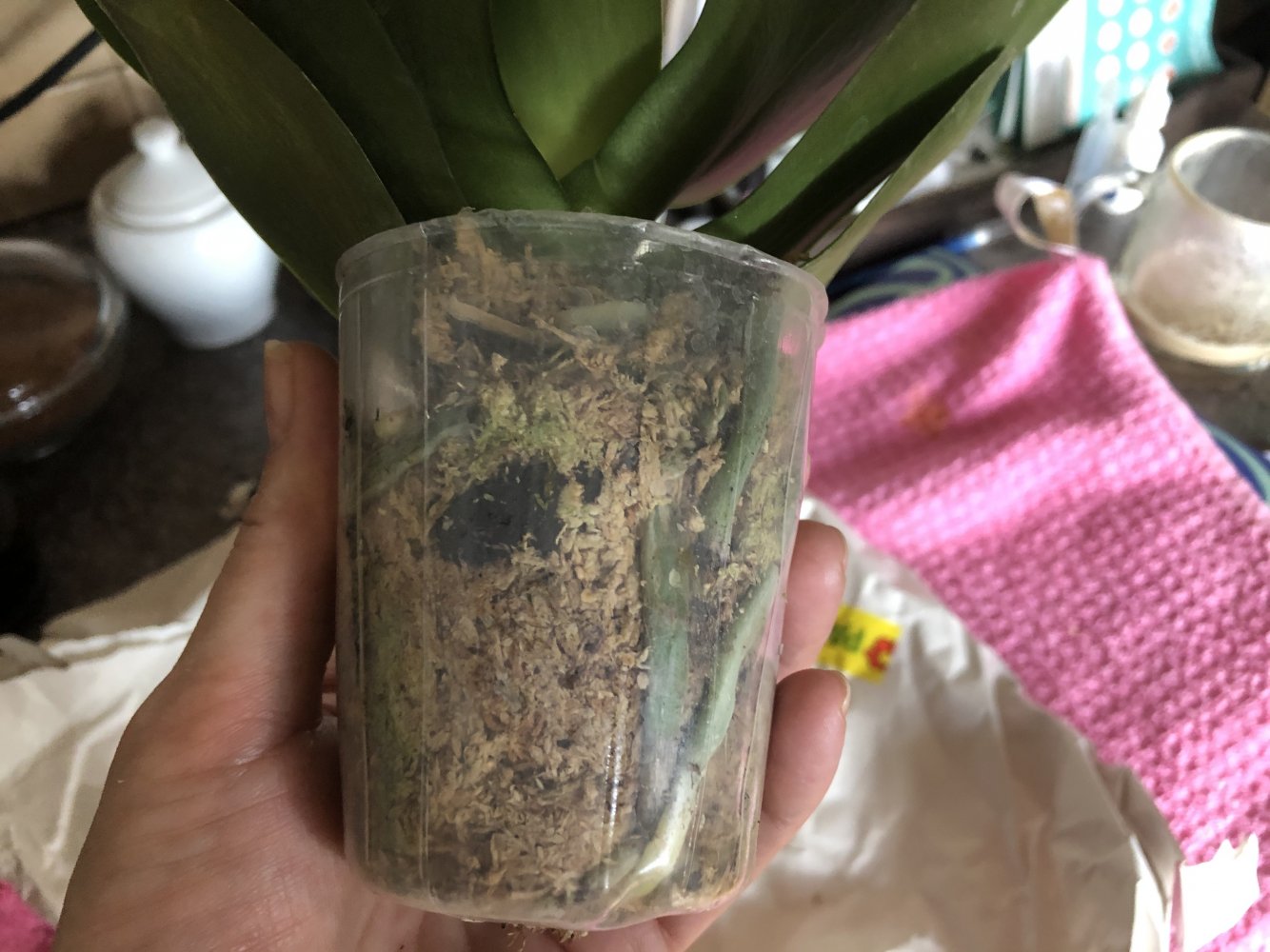 Хорошее взрослое растение. Мох усушен, корни в порядке. Довольна