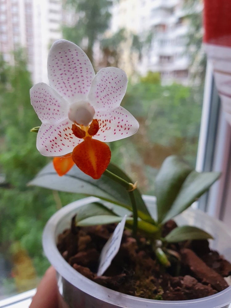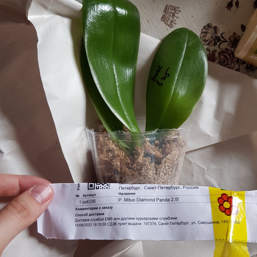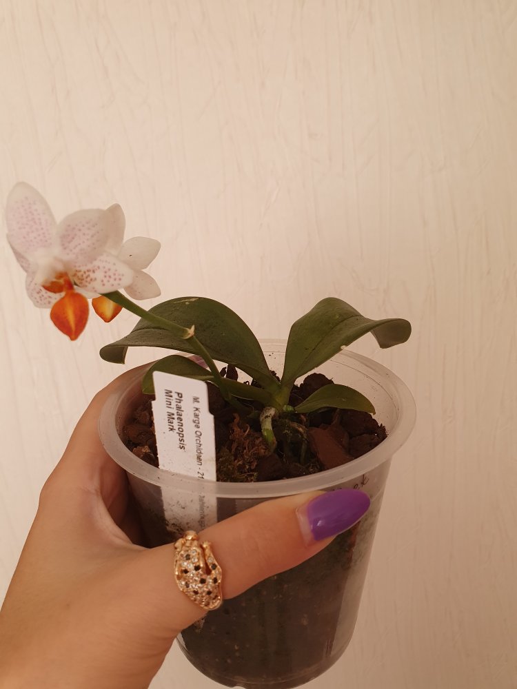 Phal. Mini Mark. Заказан 5 июля и получен на ПВЗ 6 июля. Брала из наличия, замечательный малыш, цветёт 2-мя цветочками, посажен в кору, горшочек 12 см, 4 крепких листика, корешки в активном росте, есть табличка.