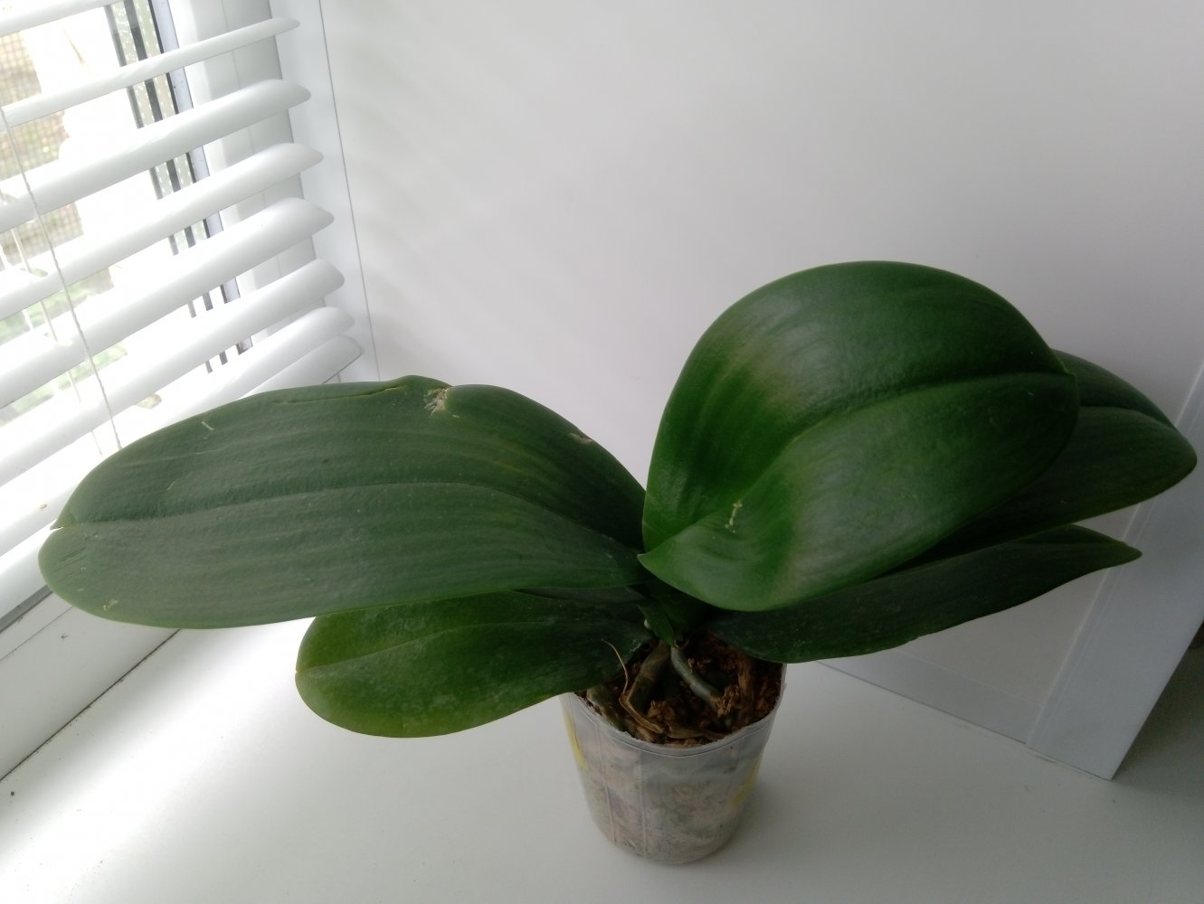 Растение крупное. К сожалению, все листы с механическими повреждениями. Корней во мхе не видно, видимо, недавно перевален в больший горшок. Ранее не цвел. В целом хорошее растение.
