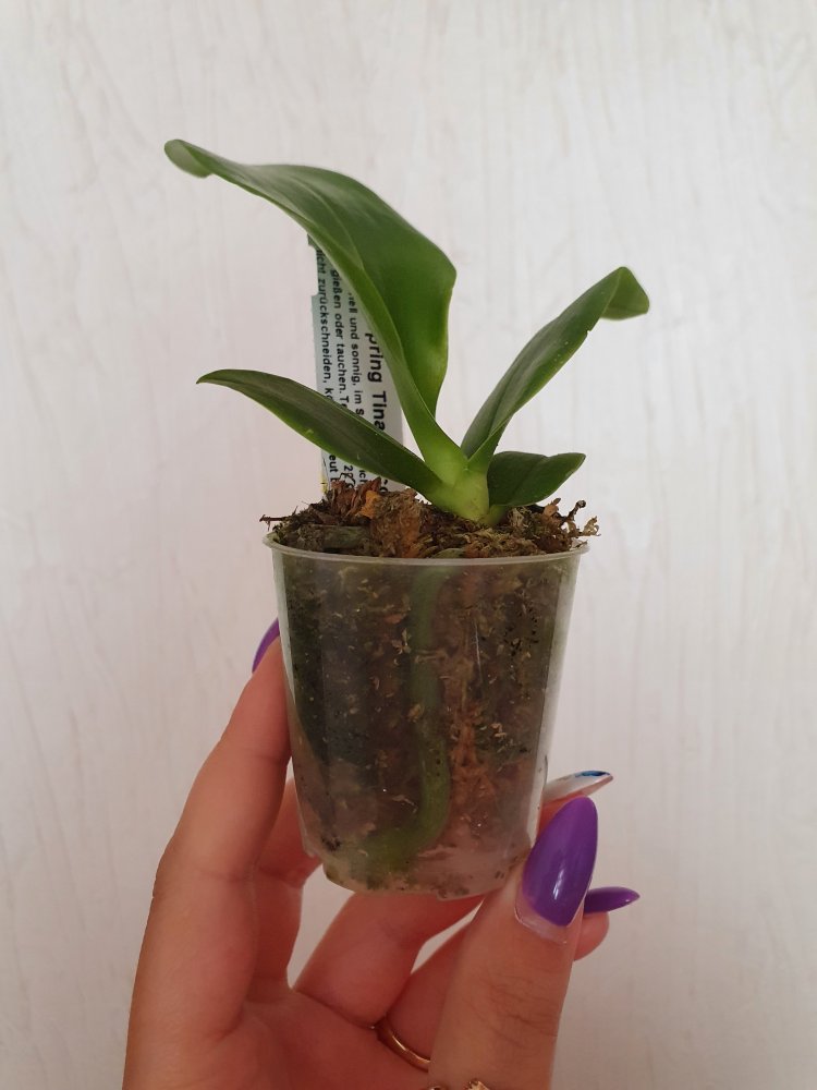 Phal. Joy Spring Tina Anaconda 6. Получено 8 июля в день смс. Растение полностью соответствует своему заявленому размеру. 4 Листика, молодой листик аж 11 см, шея чистая, корни в активном росте. Посажен в пластиковый стаканчик и мох. Мох был хорошо просушен, поэтому растение в идеальном состоянии, без пятен и всяких "неприятностей". Тургор отличный. Бирка присутствует.