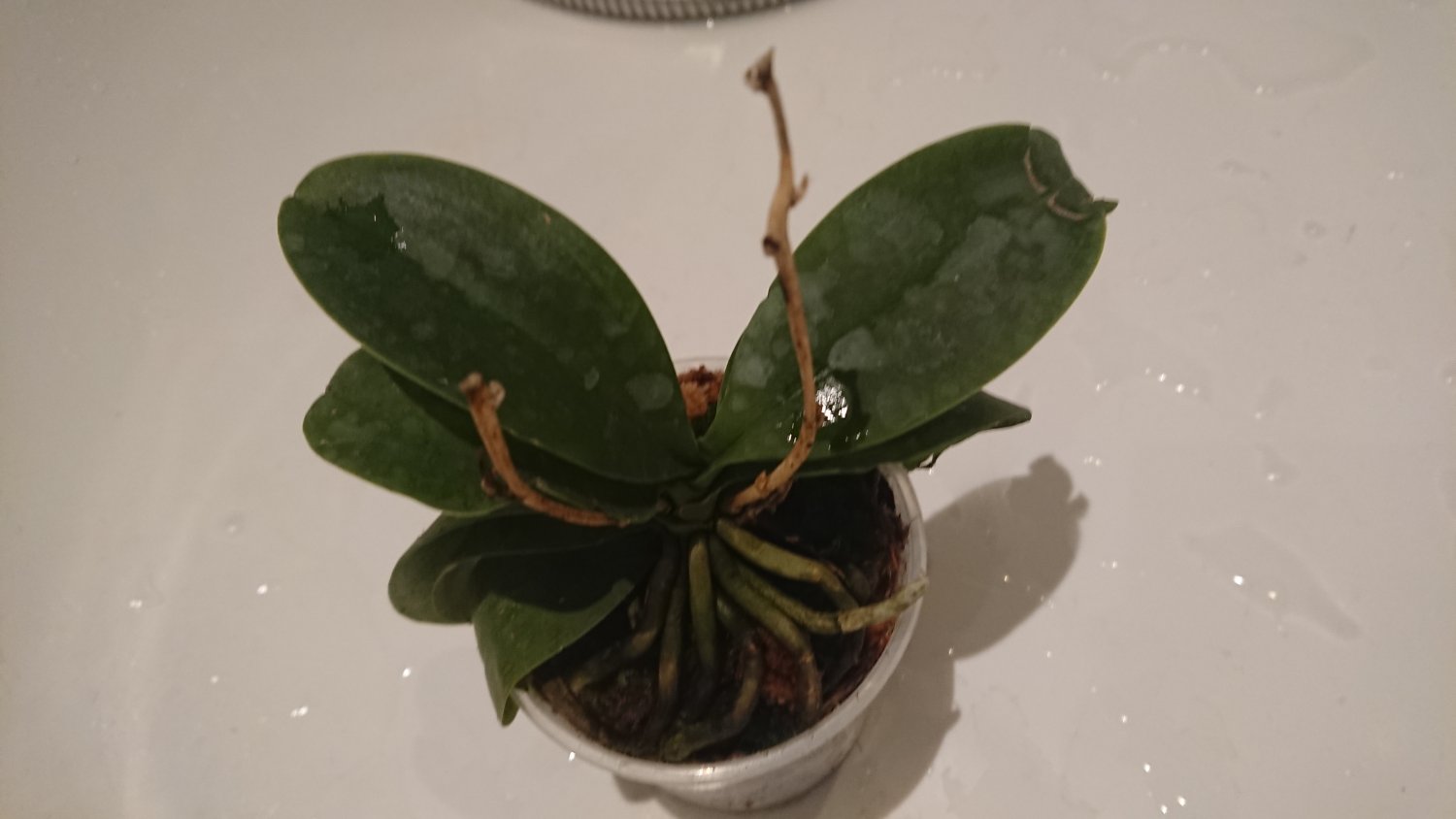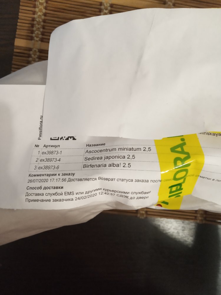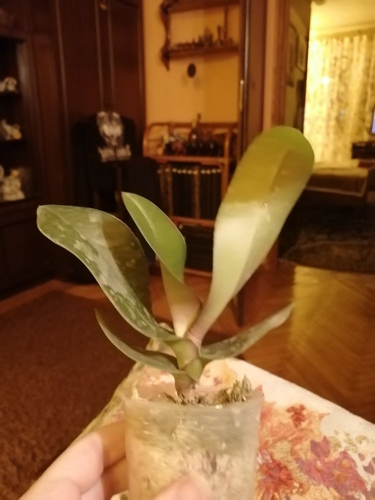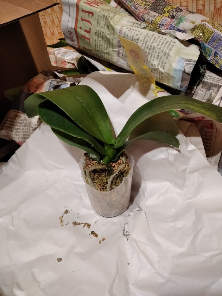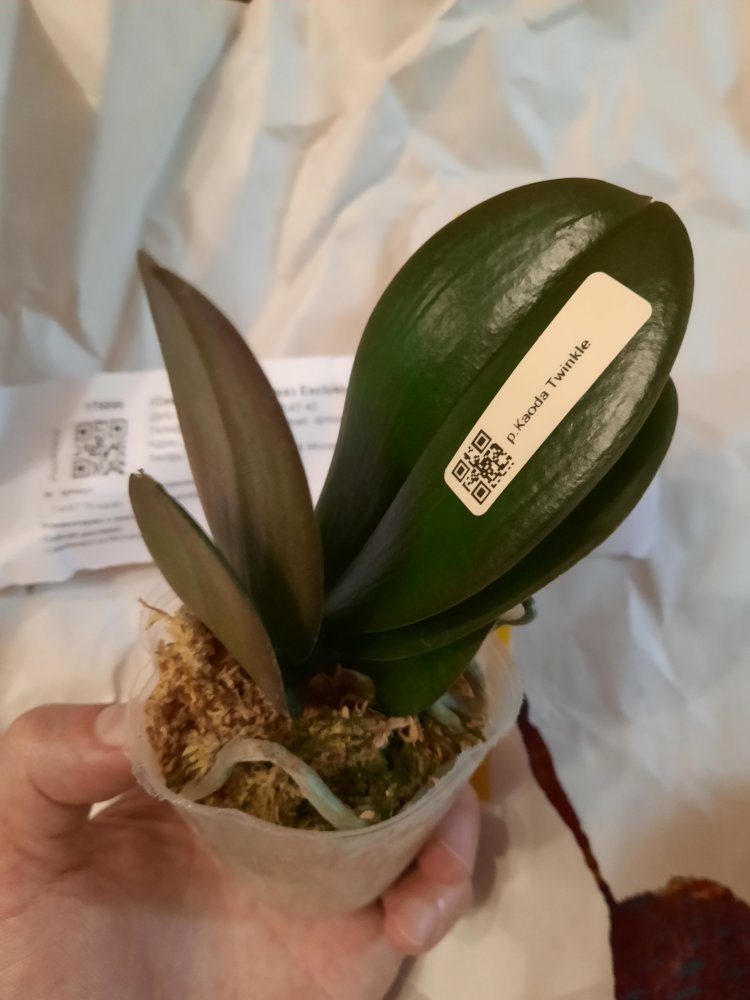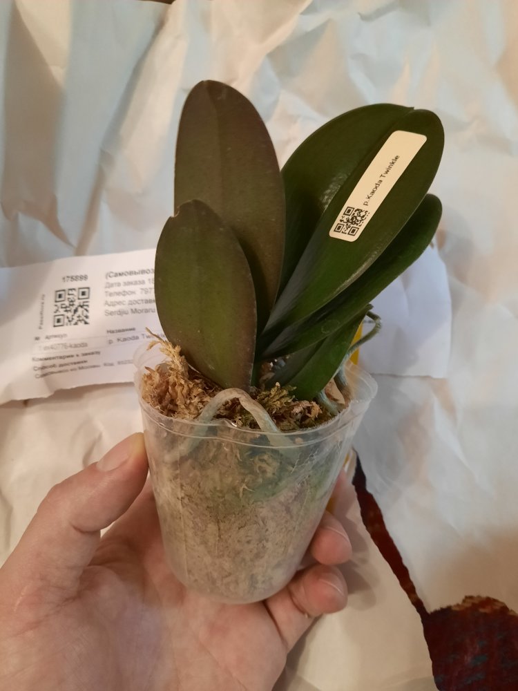 Спецпредложение 40774 FINAL SALE! Три растения комплект. Заказ получен в день прихода в ПВЗ через час после получения смс, в пути 1 час. Все 3 фаленопсисы. Один с биркой, но со сгнившей шейкой и отвалившимися листьями без живых корней- просто навыброс. Второй взрослый, здоровый, с корнями, только без бирки и тургора, в сухом мхе. А третий... такая кроха - два подвядших листика длиной пару см и два малюсеньких корешка, свежепосажена в мокрый мох- явно только что снятая детка, надеюсь выживет.