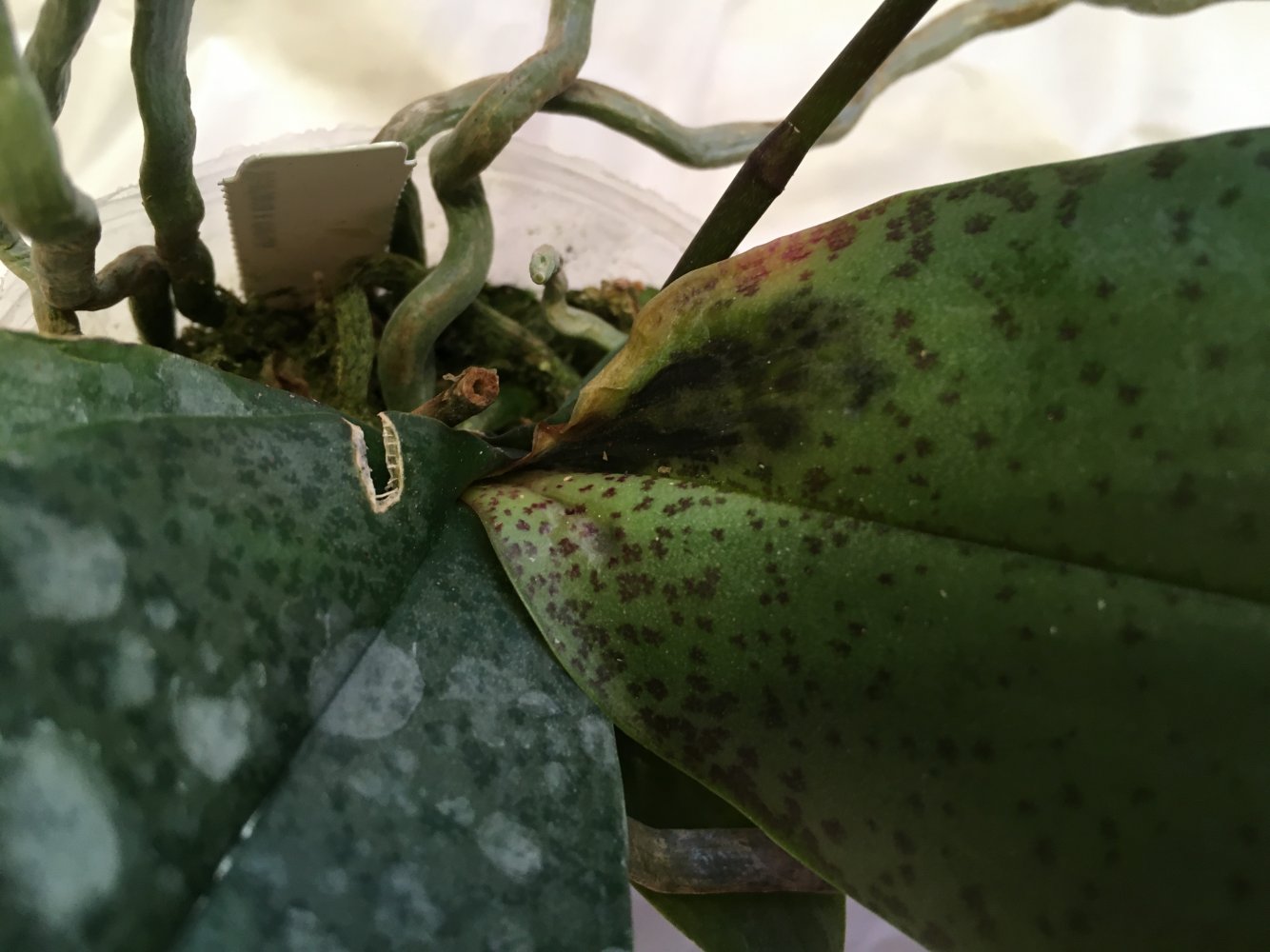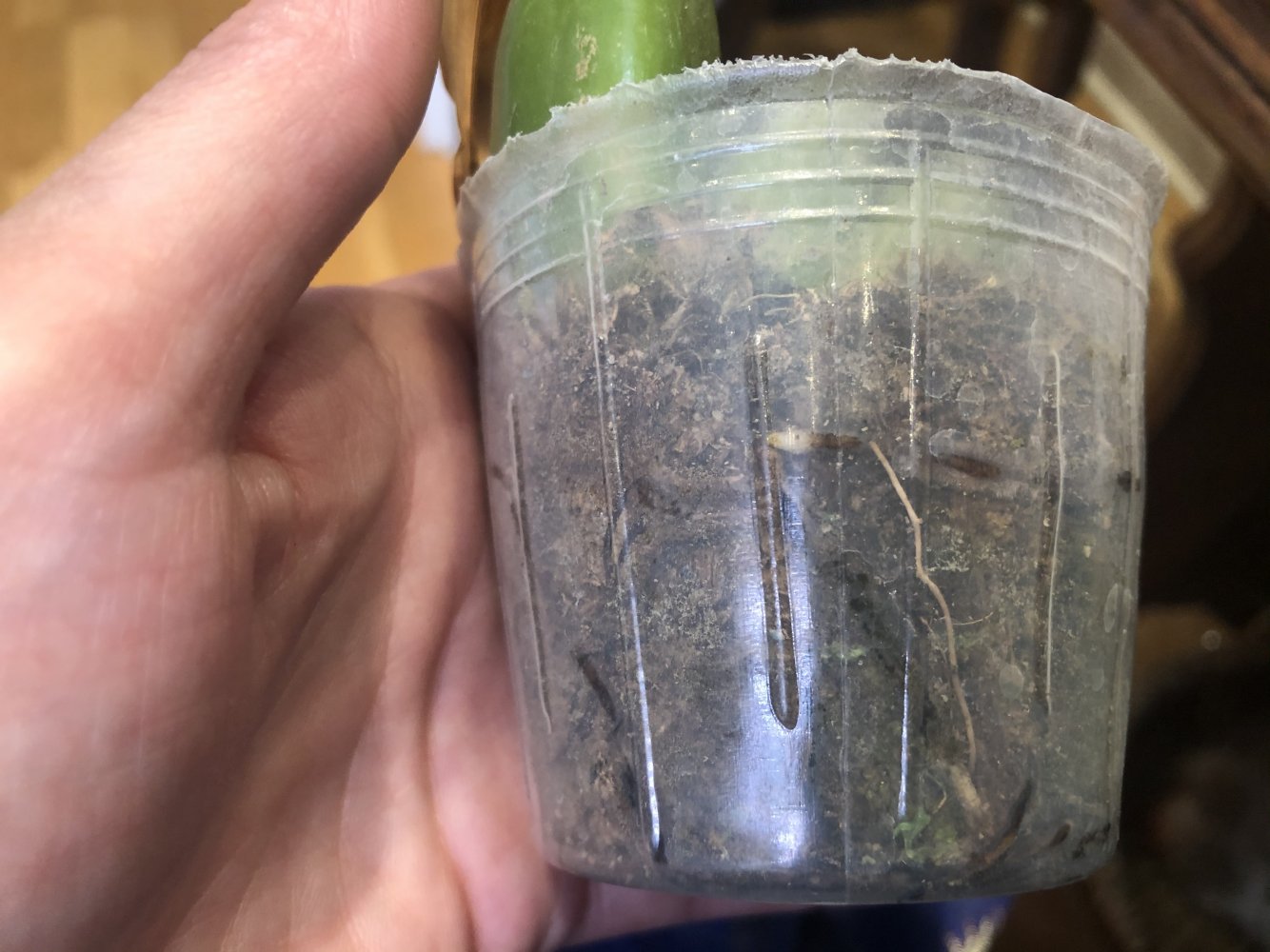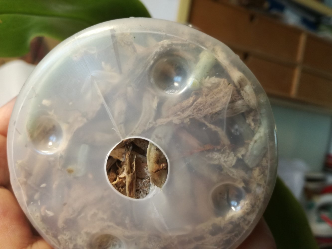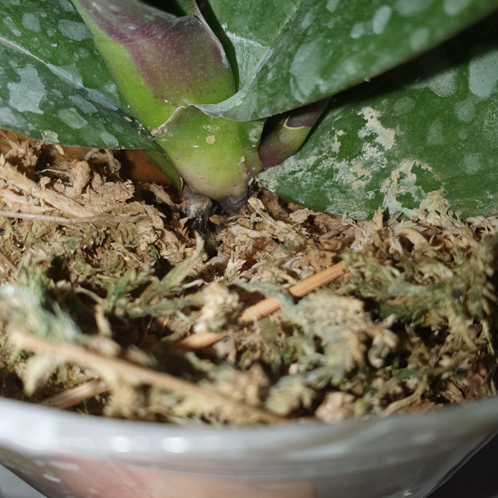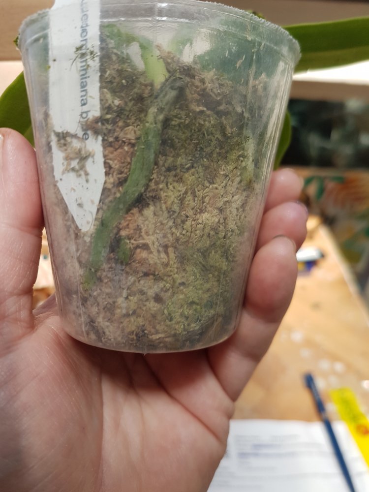 С корнями не очень хорошо: много сухих, сломанных корней на дне горшка. Мох очень сильно усушен. Я уверена, что растение выправится, наростит новые корни. Спасибо Пассифлоре.