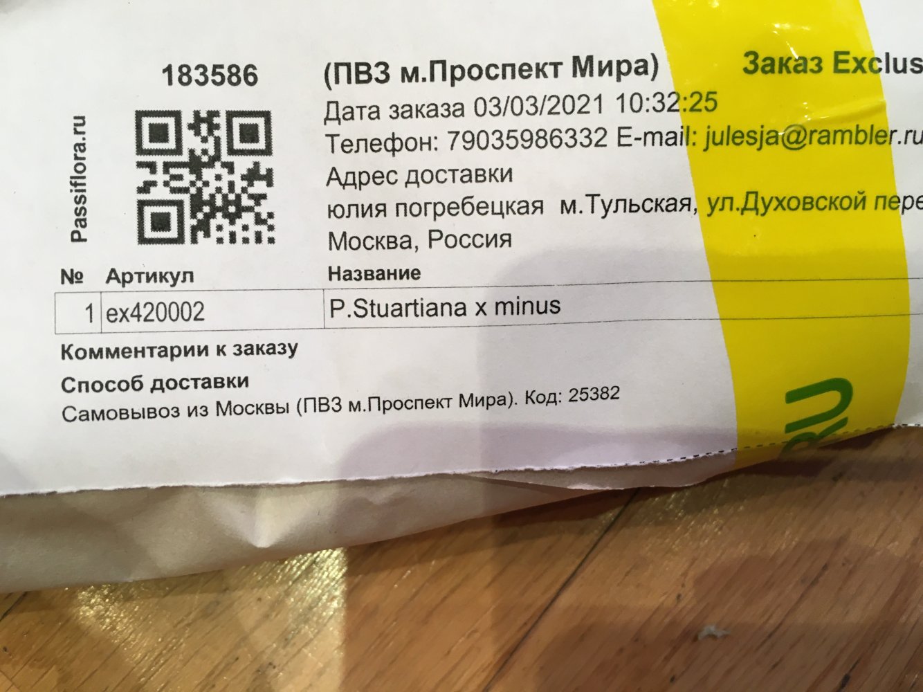 Получен заказ 20 мая 21г. Самовывозом через 5 часов , после прихода смс с ПВЗ Проспект мира, Москва.