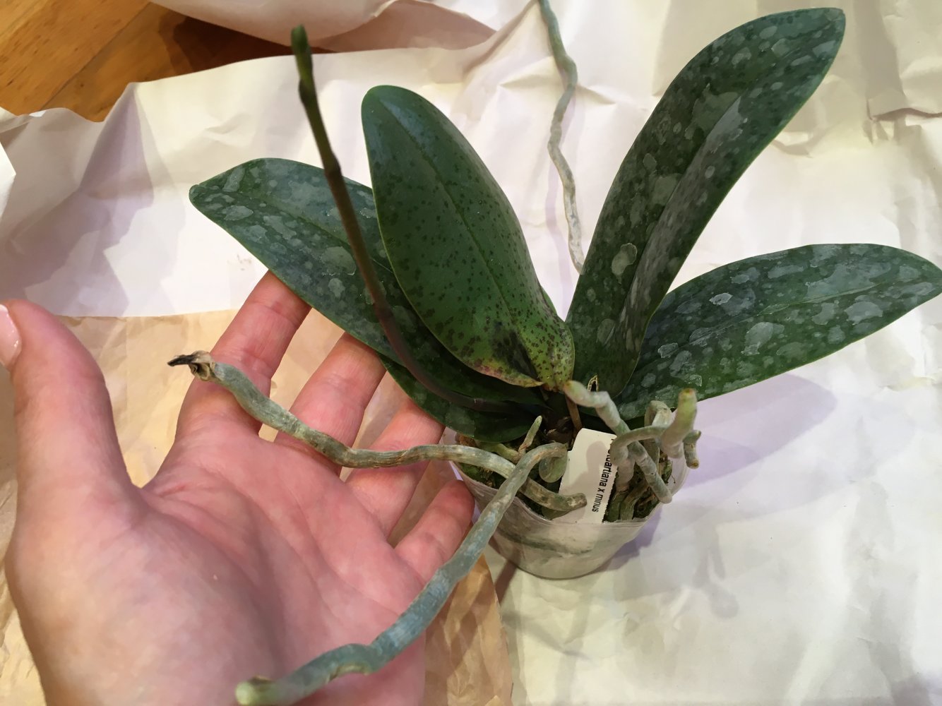 Заказ #158397 P.Sogo Relex 3.5 допоставка. СМС пришло 17 мая, заказ получен в ПВЗ 18 мая. Растение хорошее . Достаточно листьев и корней. Хорошо просушено. Было бы все замечательно, но уже распаковывая обратила внимание на листья. Вытянутые, удлиненные они отличались от цветущего на данный момент у меня sogo Relex ((хоть и говорили что нет смысла на листья смотреть, однако отличия очень заметны). На бирке было название phal. su's glad kid 'blue'. Уже второй раз в этом месяце получаю растения не те, что заказывала. И судя по отзывам в другой ветке не только я((( К самому растению претензий нет. Даже цветонос проклюнулся)