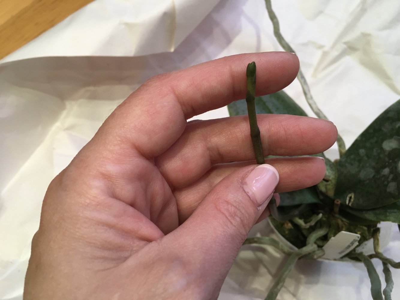Получен на следующий день после смс.Растение в горшке 3,5.Мох просушен,корневая в порядке.Растение бодрое,имеет три цветоноса,на кончиках ещё могут развиться бутоны.Растением довольна)