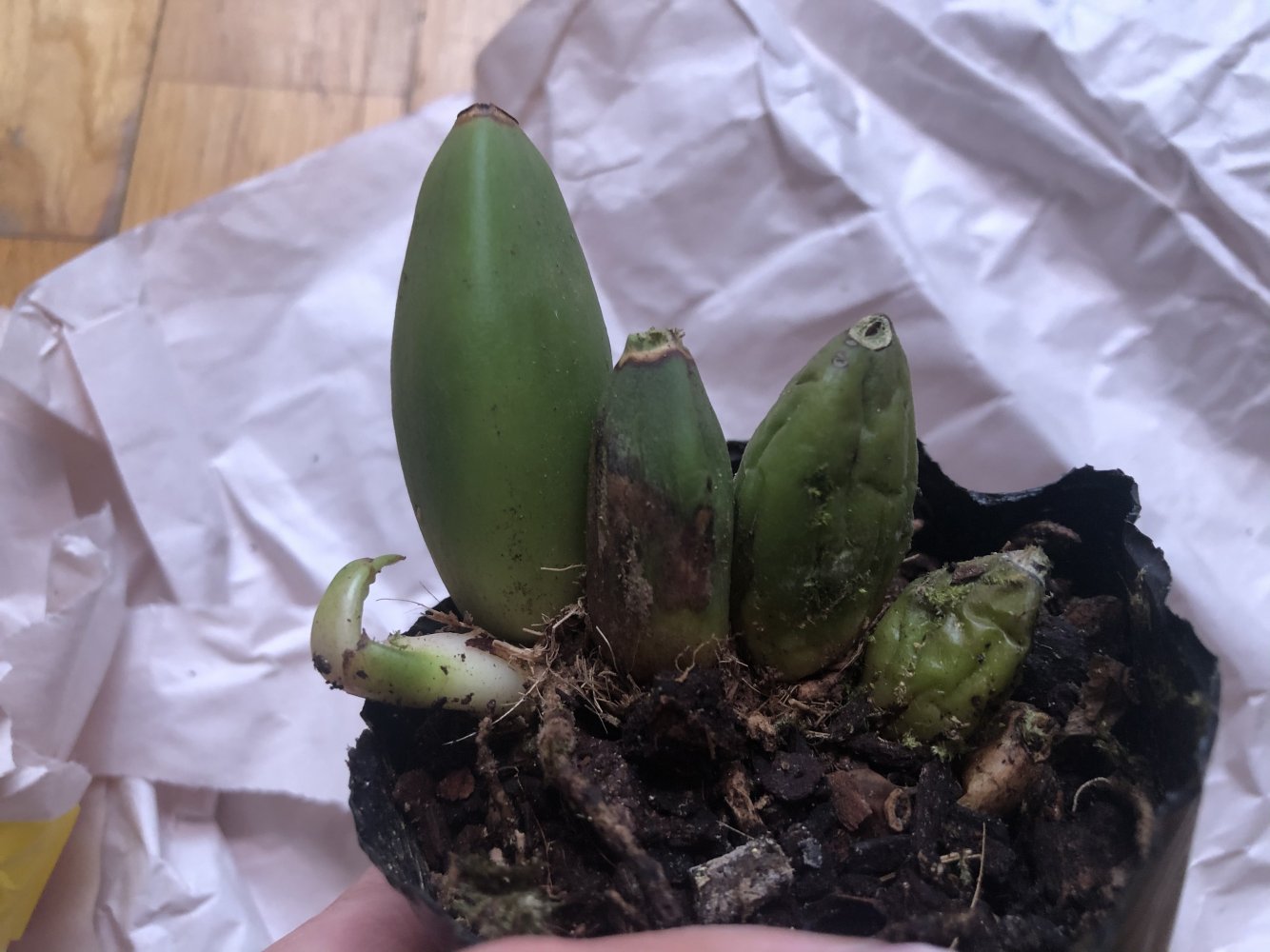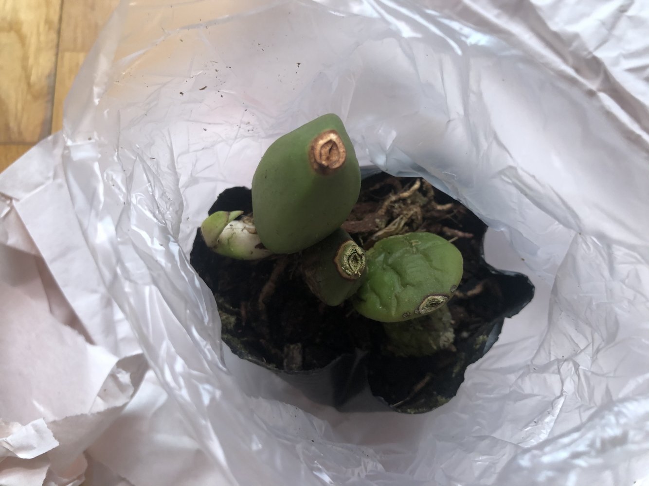 Растение миниатюрное с 4мя зелеными блестящими бульбами: большая 4 см, маленькие по 1 см и новый рост. В чёрной мелкой коре и полиэтиленовом 5 см гибком горшке.