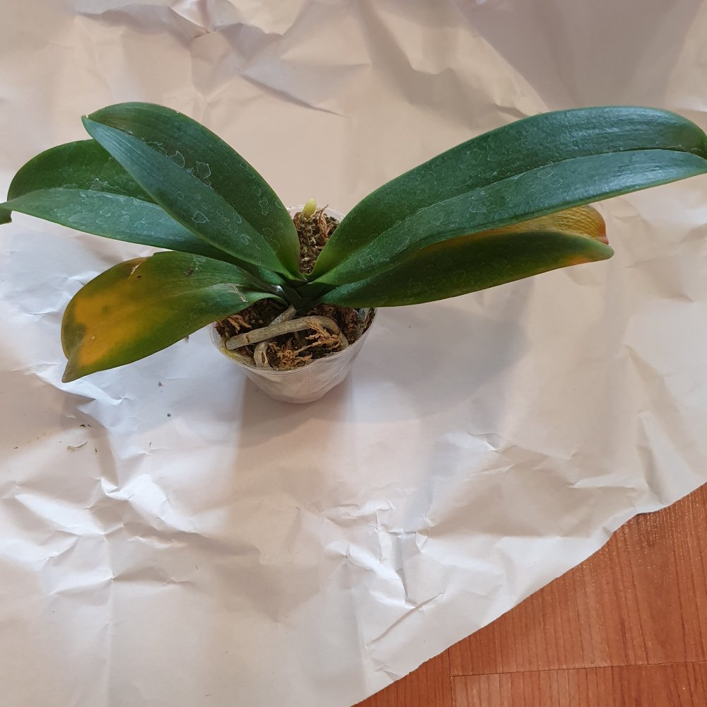 Нижние листочки желтят, но это от стресса я думаю, т.к. корни живые раскукленные, шейка чистая, листья здоровые и в тургоре, есть остаток цветоноса.