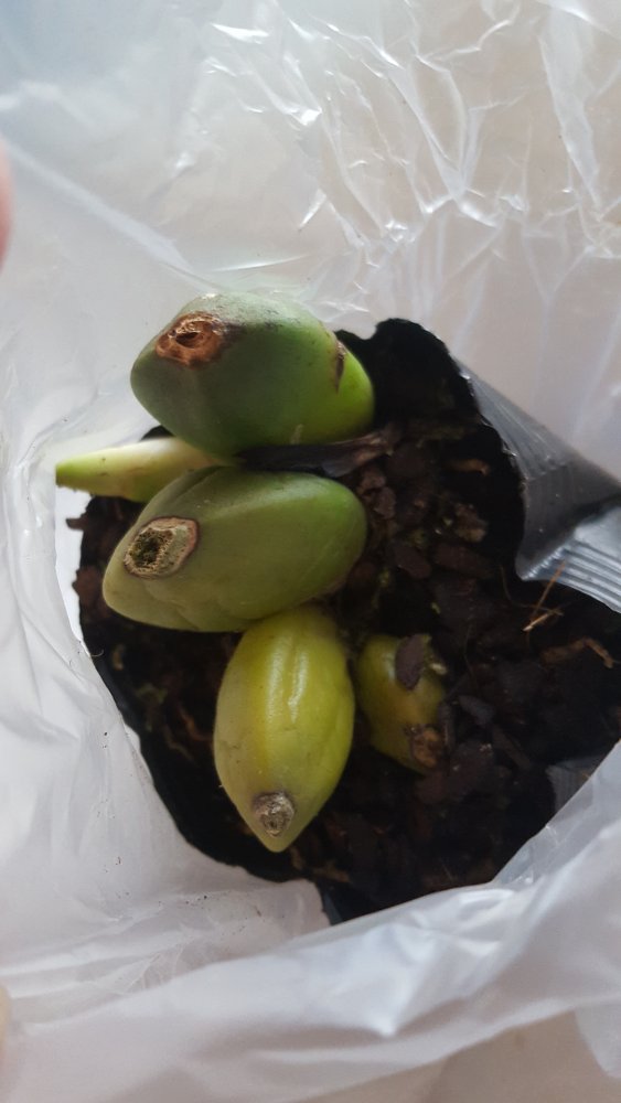 Есть две бульбы и новый рост, который частично сопрел в пути, наверное. Радует, что процесс этот начался с кончиков листьев, а центр остался зеленый. Надеюсь восстановится.
