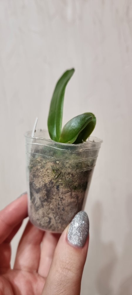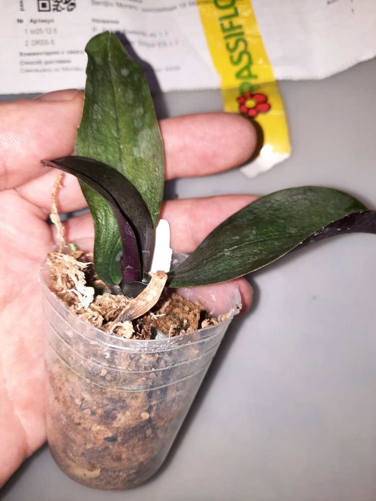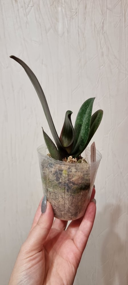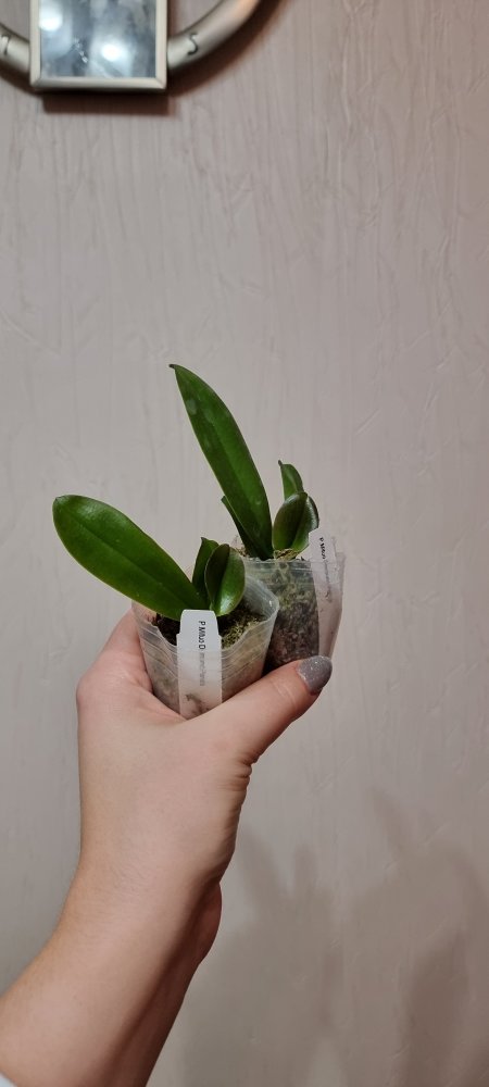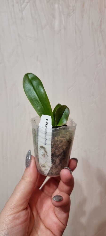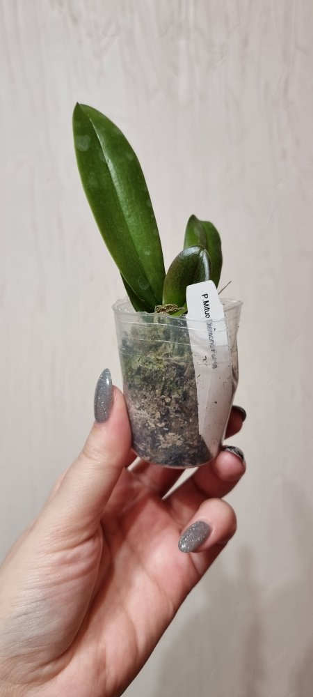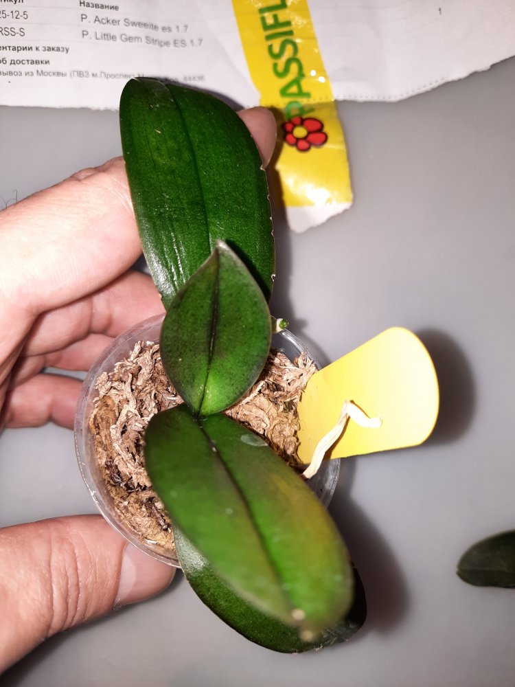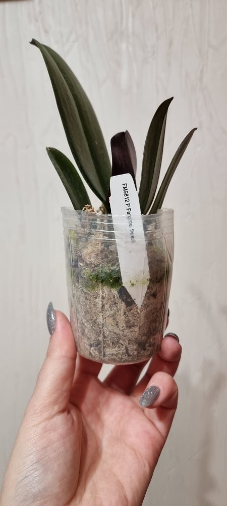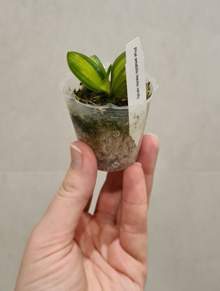 P. Amabilis variegated ex 33093 Заказ был оформлен 02/09/2019, в ПВЗ получен в день поступления 21.02.2022. Пришло очень молодое растение, явно недавно высажено из фласки. Клопик, но листочки красивые. Возможно, когда разместят информацию о том как быстро растить таких малышей, впечатление при получении подобных изменится, а сейчас - размер очень расстроил. Мох хорошо просушен, тургор сохранен. Корней не видно. Бирка с названием вложена. В целом, малыш хороший, вредителей не обнаружено. Высота горшочка 5 см.