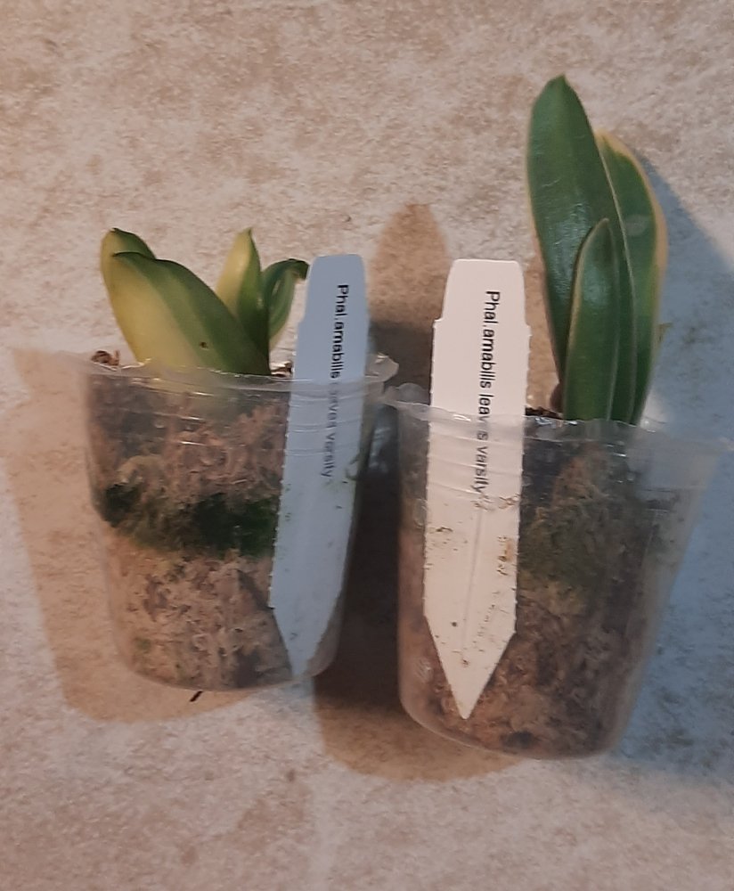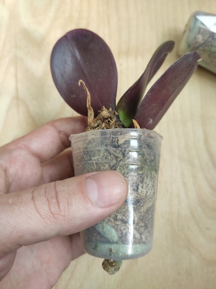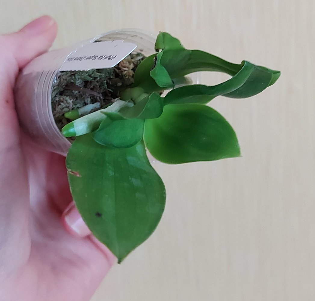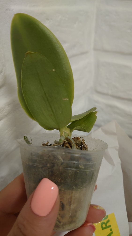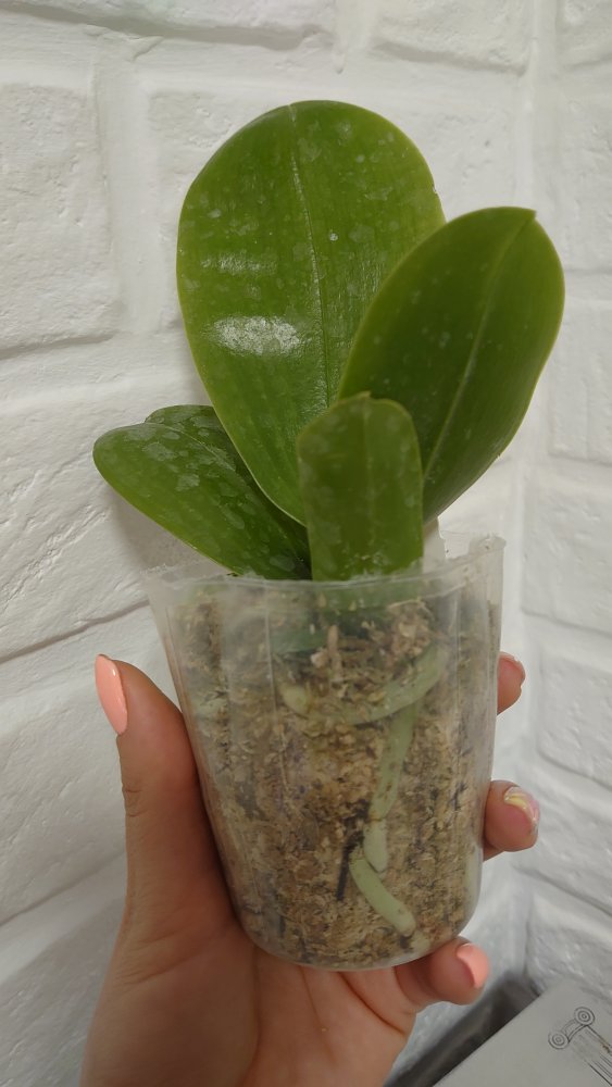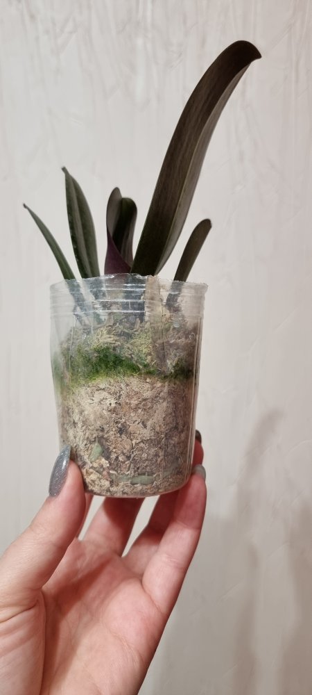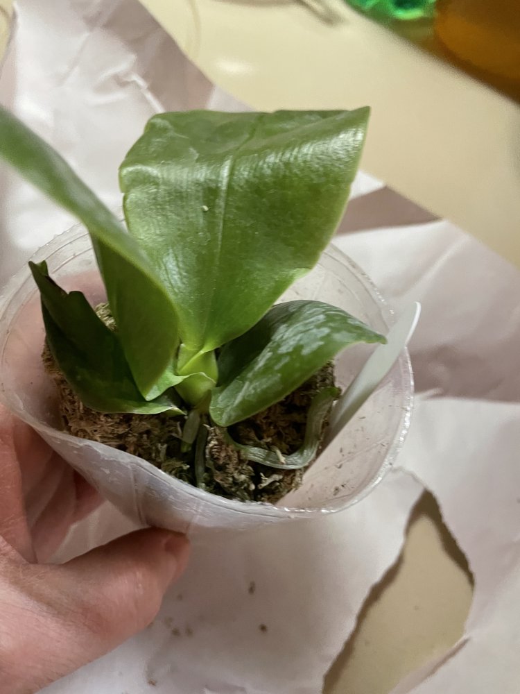 P. Amabilis variegated ex 33093 Заказ был оформлен 02/09/2019, в ПВЗ получен в день поступления 21.02.2022. Пришло очень молодое растение, явно недавно высажено из фласки. Клопик, но листочки красивые. Возможно, когда разместят информацию о том как быстро растить таких малышей, впечатление при получении подобных изменится, а сейчас - размер очень расстроил. Мох хорошо просушен, тургор сохранен. Корней не видно. Бирка с названием вложена. В целом, малыш хороший, вредителей не обнаружено. Высота горшочка 5 см.