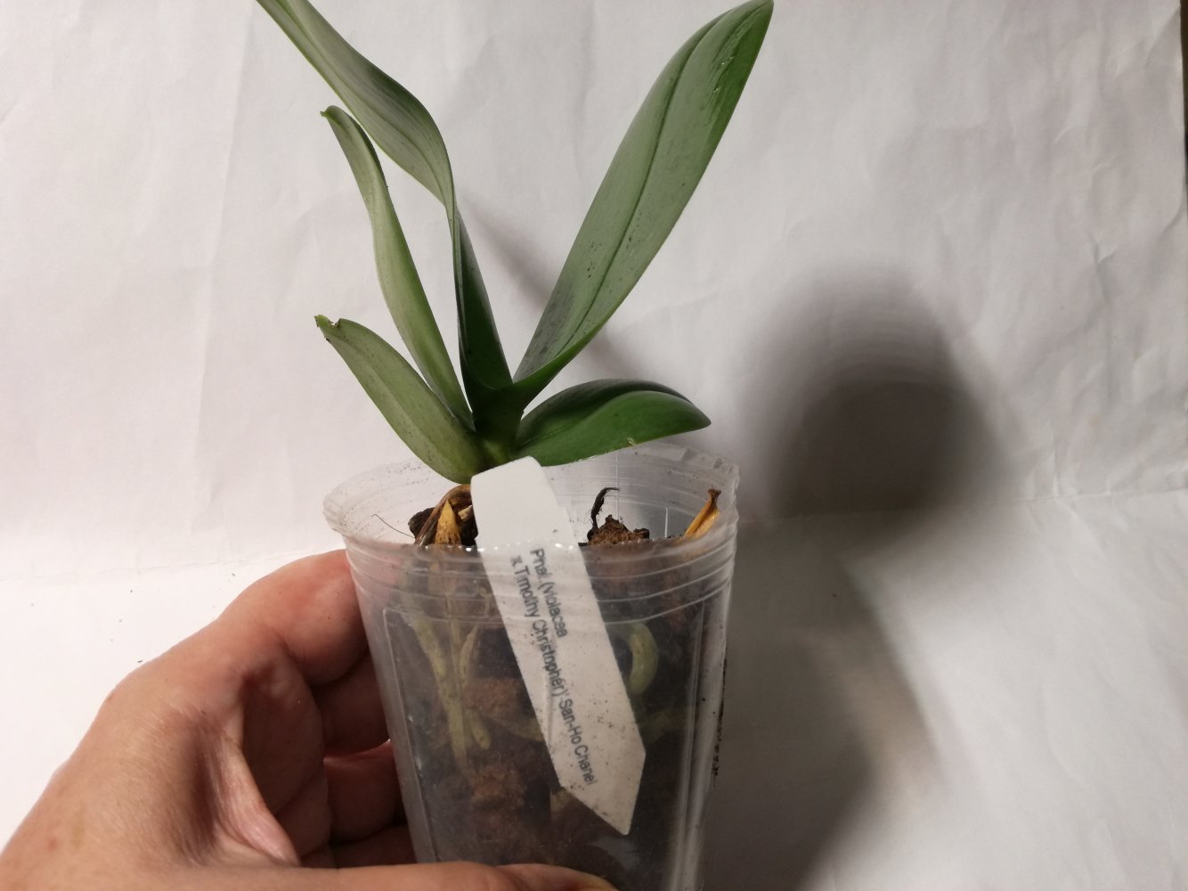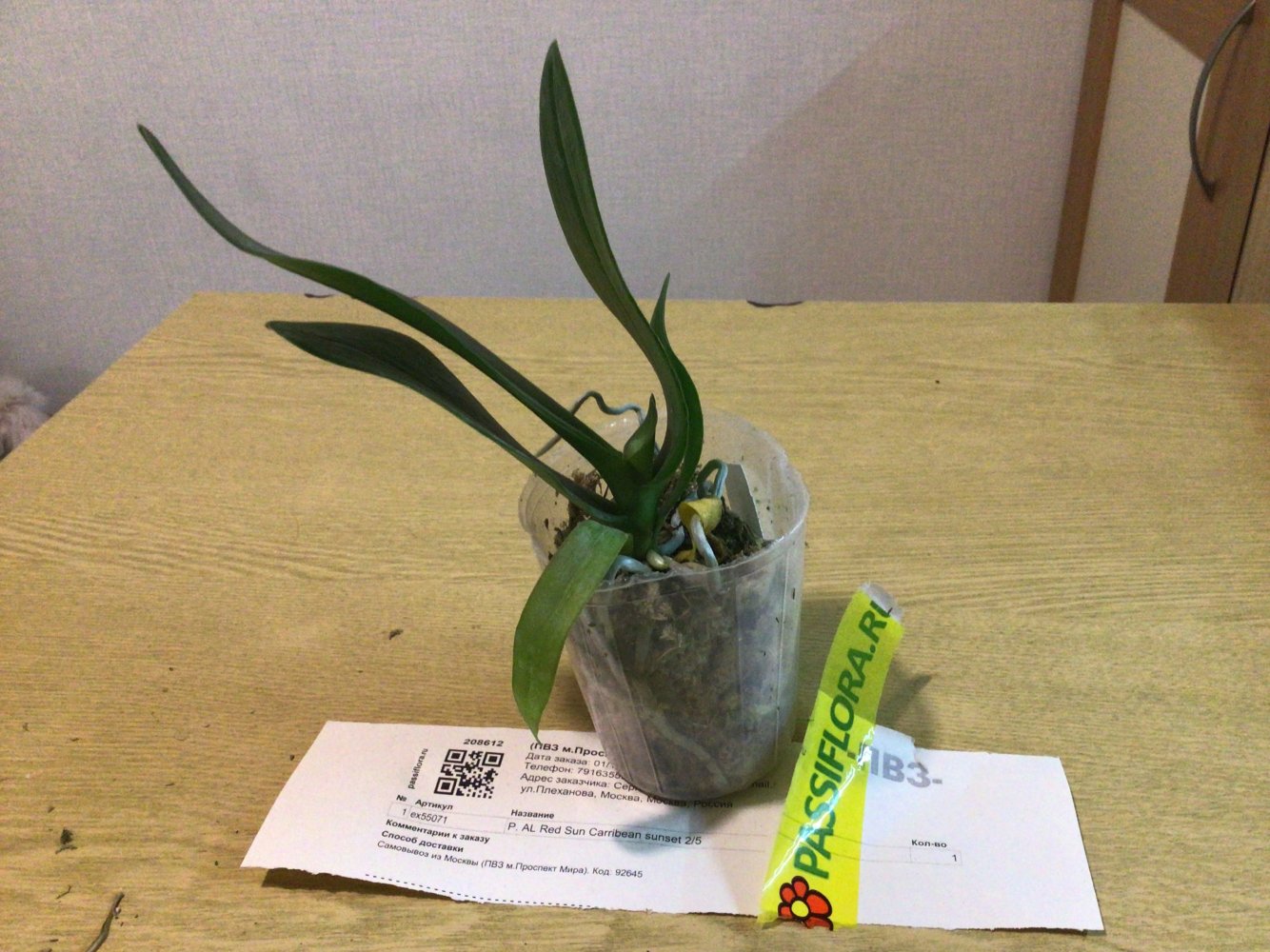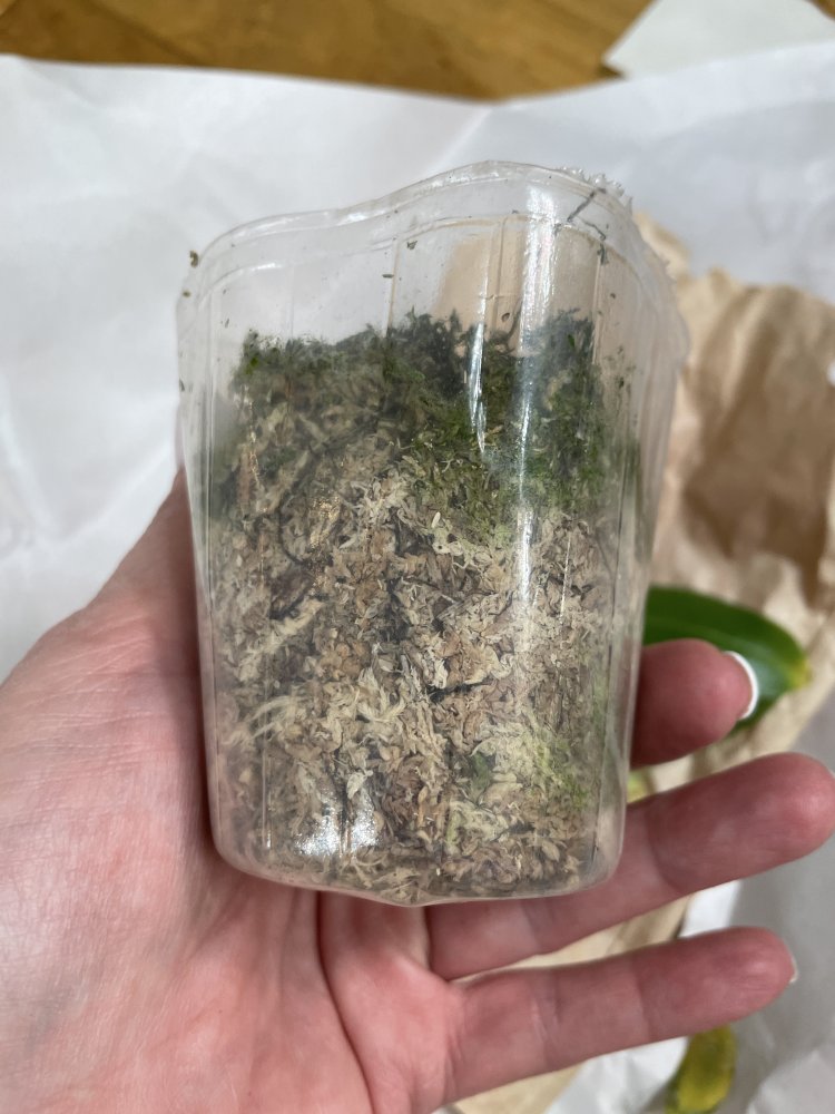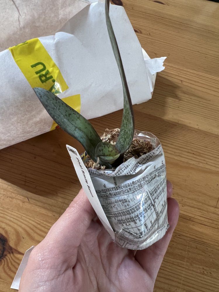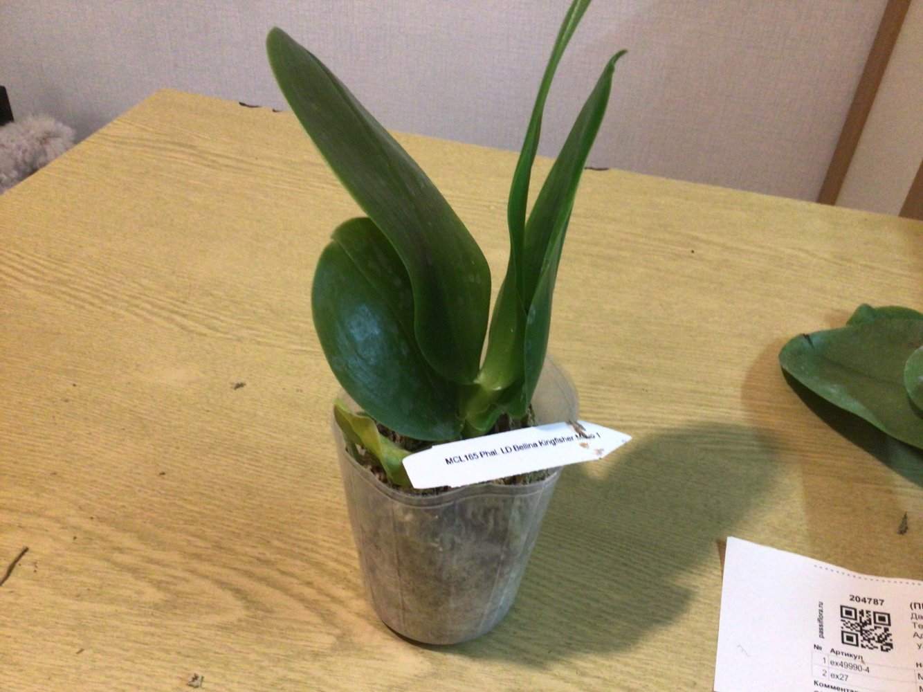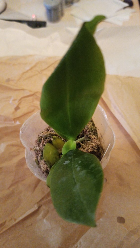Получен сегодня в ПВЗ Phal.( violacea x Timothy Christopher) "San-Ho Chanel". Спец.50025. Растение отличное, в размере 2,5, бирочка в наличии. Листочки очень хорошие, в тургоре. Корни похуже, частично усохшие. Растение посажено в смесь мелкой коры со мхом. Субстрат пересох, на четверть объема высыпался из горшка.