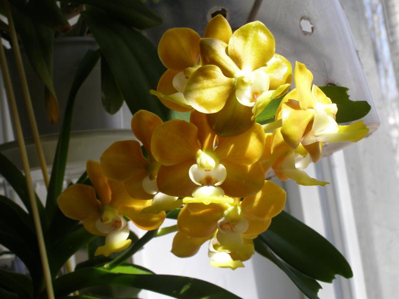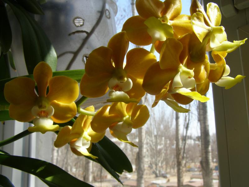 Со скрипом, но выкладываем. Вот ascocenda kenny gold x vanda denisoniana. Очень компактная , высота всего от корзинки 23 см, размах 30см. Листья вниз опущены, немного перекручены, как ремешки. У меня давно,цветет часто, я уже и не фотографирую даже. Пахнет пол дня , с утра, вишневым цветом, сильно, аромат хватает на комнату. Цветов всегда много, не менее 15. Цветы довольно крупные 5-6 см, плотные. Ну очень красивые!